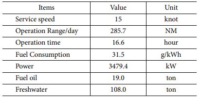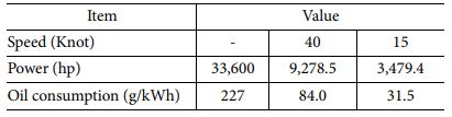 그리고 2000 NM를 운항하기 위해 소모될 연료와 청수의 무게를 추정하였다. GE Aviation 사의 25.1 MW 가스터빈 엔진의 최대출력 33,600 hp일 때 227 g/kWh의 연료가 소모된다[26]. 이러한 정보를 바탕으로 CFRP 설계함의 최대속력 40 knots로 운항할 때의 출력과 연료소모량 계산 후, 서비스속력 15 knots로 운항할 때 출력과 연료소모량을 도출하였다(Table 4).