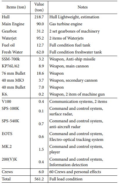 본 설계경비함의 loading-condition 별 무게추정을 위해 엔진을 제외한 선체 무게만 추정하였다. Table 5에서 보이는 선체 무게는 엔진과 연료 및 청수 등을 제외한 선체구조의 무게 추정한 결과이며 추정할 때 유사 실적 경비함의 정보를 활용하였다. 또한, 앞서 2.2-2.4절에서 추정된 엔진과 추진 시스템의 무게는 216.4 ton이다. 연료 12.7 ton, 청수 62.0 ton, 무장 32.7 ton, 지휘와 통신장비 3.7 ton, 승무원 6.0 ton으로 추정되어 있다.