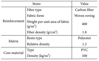 식 (1)은 RINA선급규정에서 제시하는 추정식이며 Table 6은 그 계산결과를 정리하여 보이고 있다. Table 7은 CFRP 적층판의 제작에 사용된 소재의 정보로부터 구조설계에 필요로 하는 원자재의 정보를 요약하고 있다.