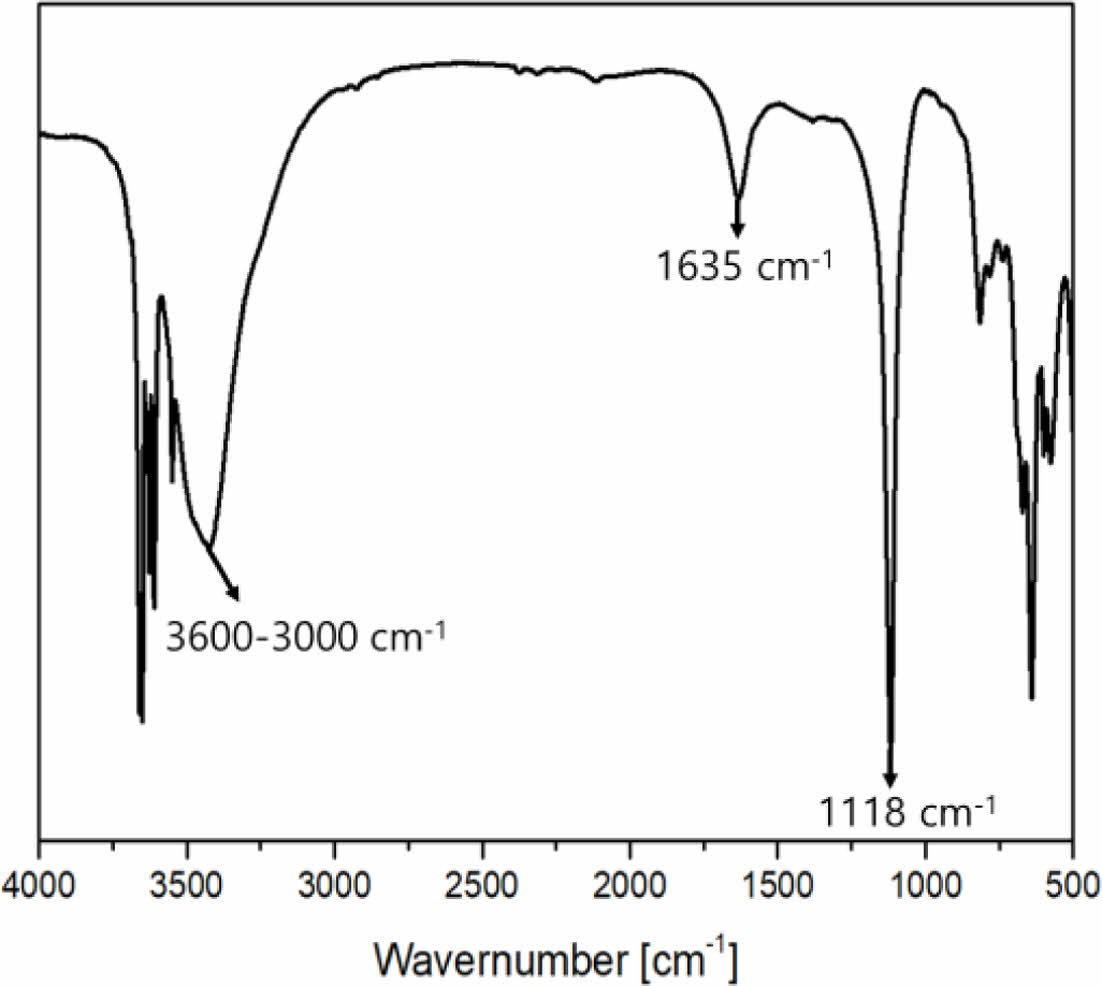 FT-IR analysis was conducted to verify the presence of specific functional groups in the MOSw (Fig. 1). 1 mole of MOSw (5Mg(OH)2∙MgSO4∙3H2O) is composed of 5 mol of MgOH2, 1 mol of MgSO4, and 3 mol of crystalline water. OH group (1,635 cm-1) of crystalline water within the MOSw, OH group (3,600-3,000 cm-1) by Mg(OH)2 on the surface, and the specific vibration of sulfate ions (1,118 cm-1) by MgSO4 were observed.