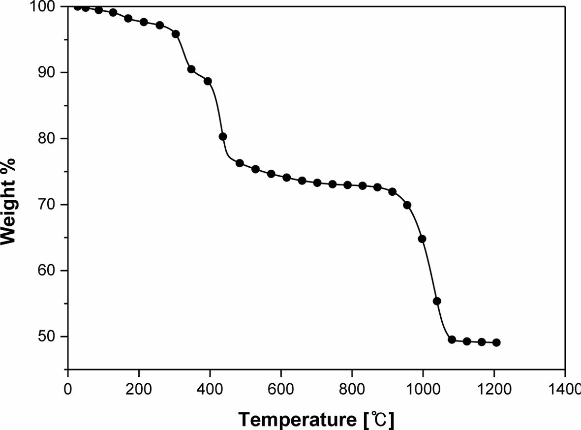 TGA graph in Fig. 2 shows typical three-step mass reduction behavior of the MOSw. The first step mass reduction (200-320oC) represents a reduction due to dehydration of crystalline water in MOSw, the second mass reduction (350-420oC) is a reduction due to dehydration of OH groups on the MOSw surface, and the last mass reduction (950-1,050oC) means a reduction due to evaporation of SO3.