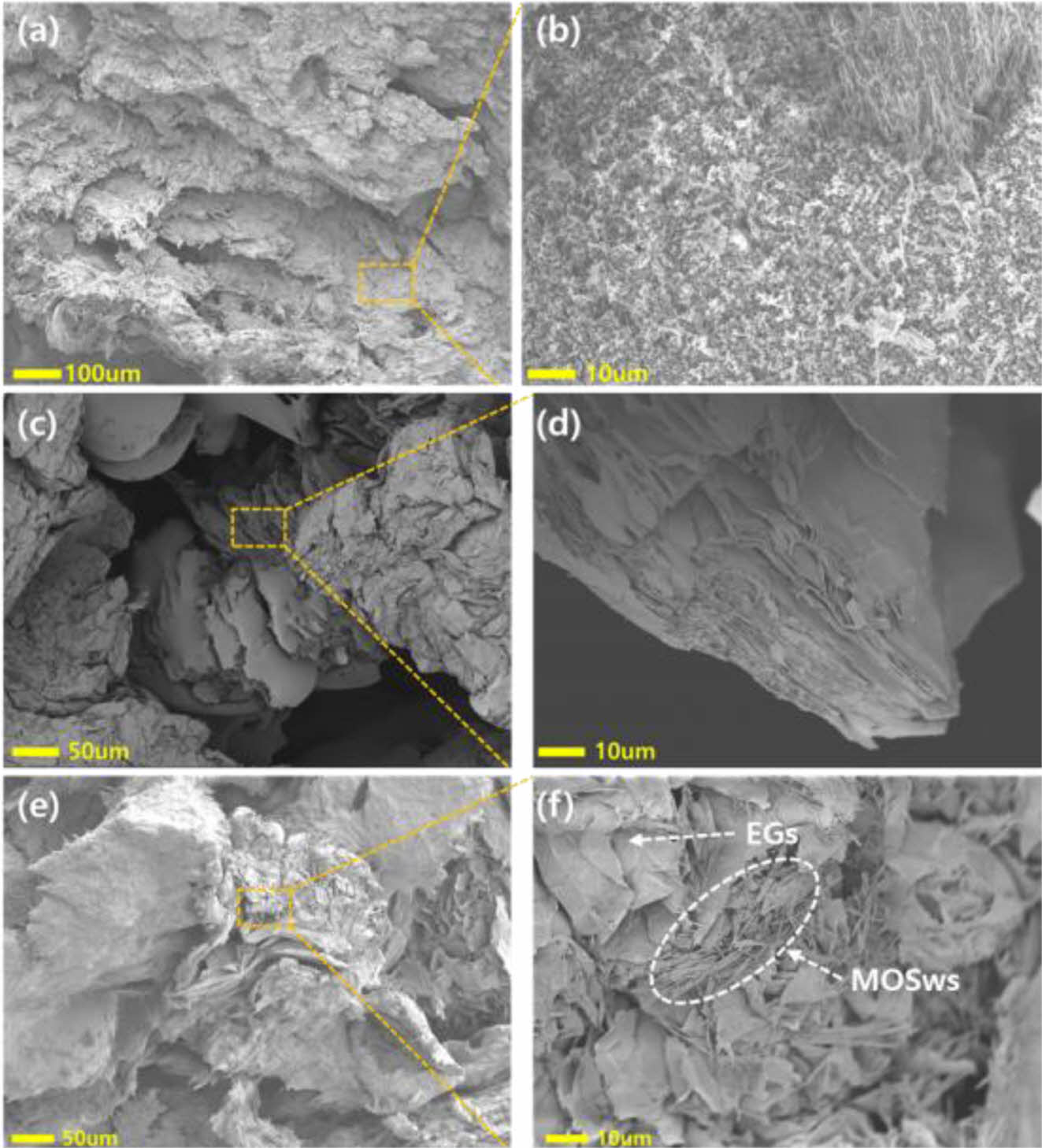 Fig. 5 SEM images of char residue after the vertical burning test ((a, b) MABS-4, (c, d) EABS-2, (e, f) MEABS-3) |