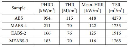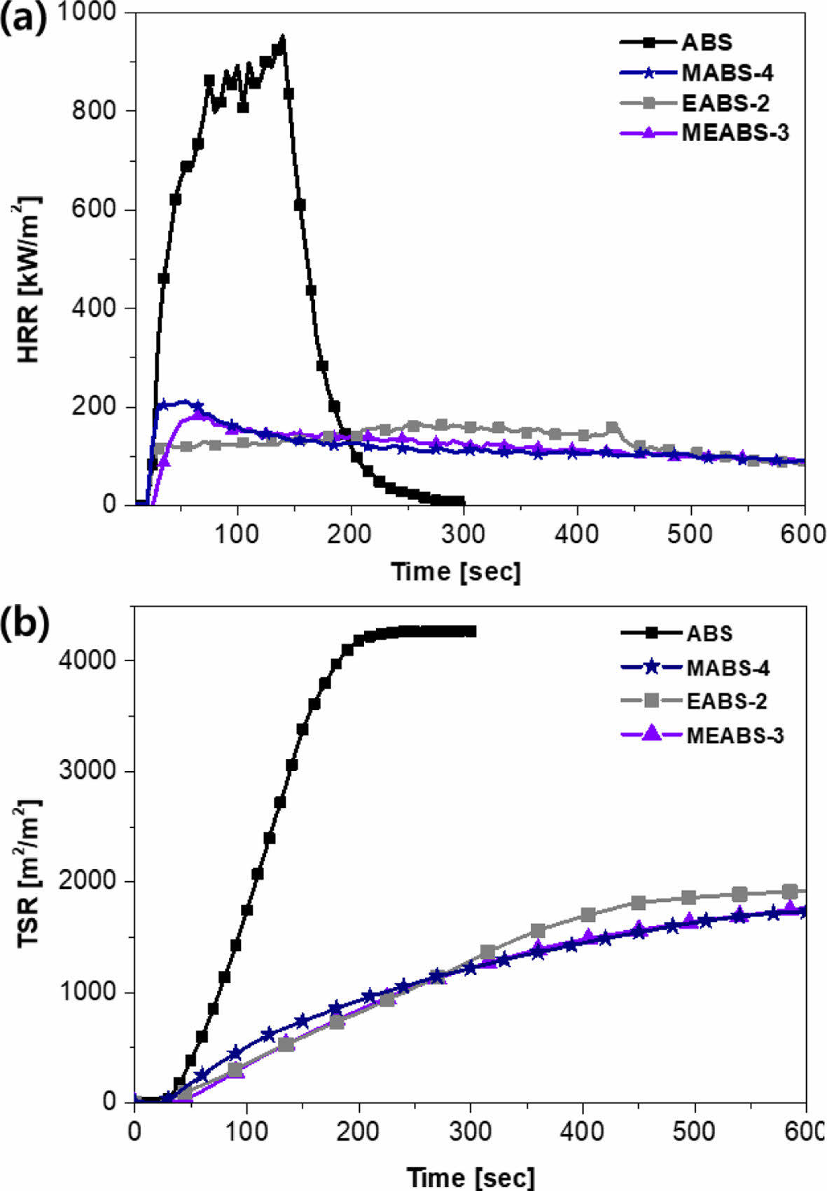 Fig. 6(a, b) are the graphs of heat and total smoke release rates on ABS and FRs/ABS composites (MABS-4, EABS-2, MEABS-3). In the case of pure ABS, high heat dissipation rates were explosively recorded within a short period of time and a large amount of heat and smoke were emitted during the test. This is because ABS, which is vulnerable to heat, undergoes a combustion reaction very quickly and is pyrolyzed [7].