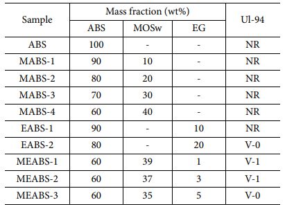 Table 4 shows the UL-94 ratings of the ABS, MOSw/ABS composites (MABS-1, 2, 3, 4), EG/ABS composites (EABS-1, 2), and MOSw/EG/ABS composites (MEABS-1, 2, 3). When only MOSw was used, even in 40 wt% of loading fractions, UL-94 rating couldn’t be achieved.