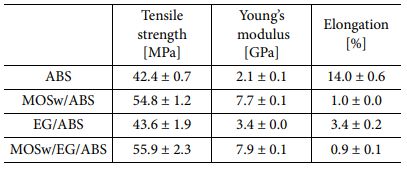 Even when the MOSw is added to ABS with a small amount of EG, mechanical properties are comparable to the composite that only MOSw is used. It is believed that the MOSw and EG show uniform dispersion at the corresponding content. Table 5 Table 6