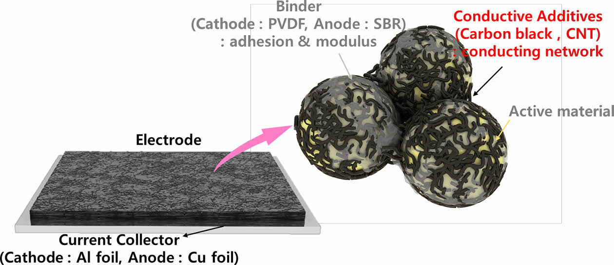 일반적으로 리튬이온전지는 양극, 음극, 분리막, 전해액, 집전체로 구성되어 있으며, 전극은 Fig. 1과 같이 용량을 구현하는 활물질과 함께 전극 내 도전 네트워크를 형성하여 도전성을 부여해주는 도전재(carbon black, CNT)와 전극 슬러리의 증점제 역할 및 전극의 결착특성을 부여하는 바인더 소재(PVDF, CMC, SBR, PAA)로 이뤄져 있다.