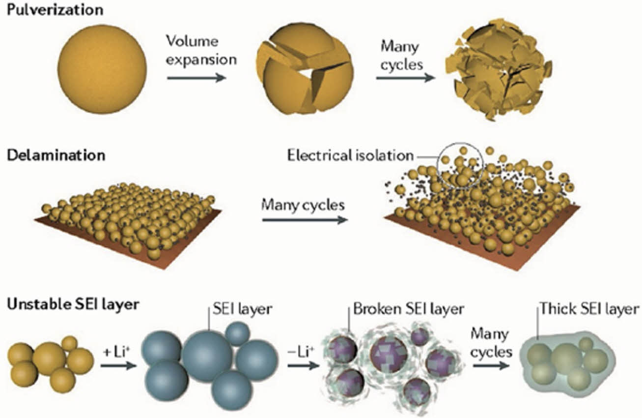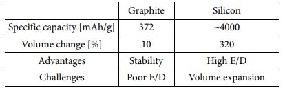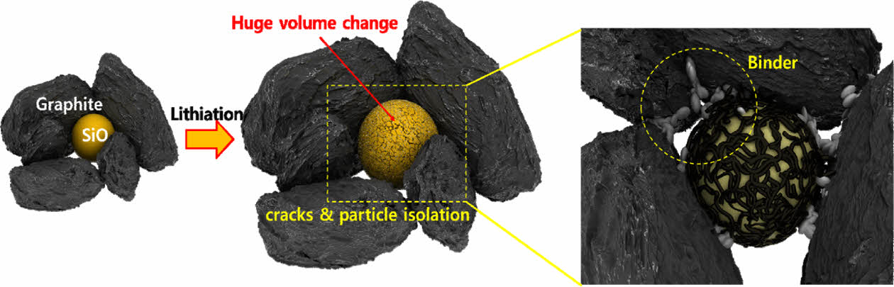 따라서 전극의 단위면적당 에너지 밀도를 높이기 위해전극 내 활물질 함량을 최대로 하기 위하여, 최소한의 함량으로도 고전도성, 고결착력을 구현해내는 도전재 및 바인더 개발에 대한 연구가 필요한 상황이다. 또한 활물질 소재 측면에서는 기존에 사용하고 있는 흑연계(~372 mAh/g) 음극 대비 높은 이론 용량을 구현해내는 실리콘(~4000 mAh/g)과 같은 고용량 소재에 대한 연구가 진행되어 왔다(Table 1). 하지만 Fig. 2에서 보면 알 수 있듯이 실리콘계 음극 활물질의 경우 전지의 충전 및 방전 과정에서의 리튬의 alloying-dealloying 과정에서 발생하는 부피팽창으로 인해 전지 수명 퇴화가 빠르게 나타나는 문제점이 있다[3,4]. 따라서 이러한 실리콘의 부피팽창으로 인한 스트레스를 완화하고 잘 견딜 수 있는 고분자 소재 개발이 중요해짐에 따라, 이와 관련된 연구가 활발히 진행되고 있다.