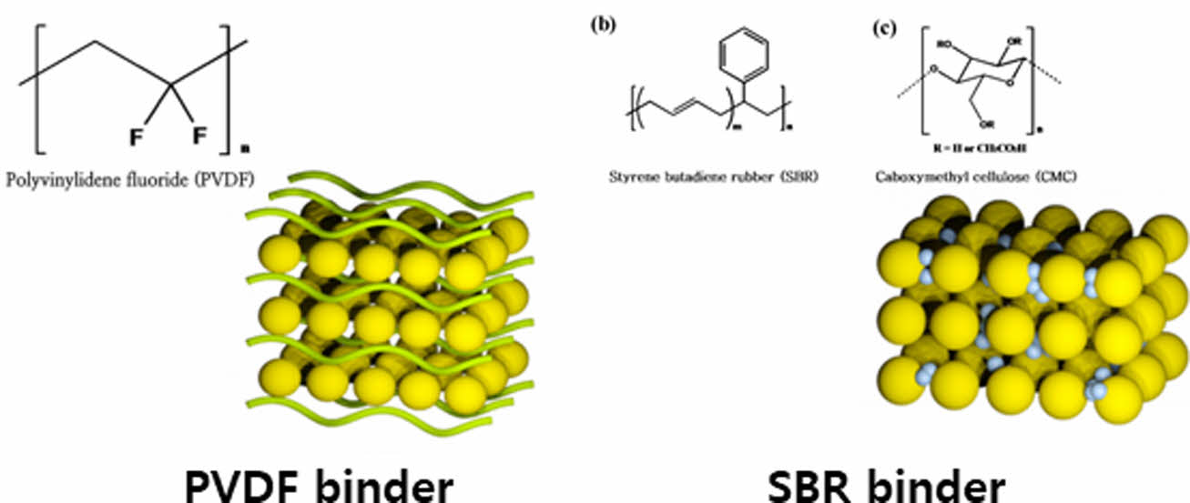 리튬이온전지용 바인더의 주요기능은 전극 내 고르게 분포하여 활물질과 활물질간 그리고 활물질과 집전체 사이의 접착력을 유지함으로써 지속적인 충방전과정에서 발생하는 화학적, 물리적 스트레스로 인한 전극의 퇴화를 방지하는 것이다. 이러한 바인더의 접착 특성은 크게 두가지로 구분할 수 있는데, 반데르발스 힘(van der Waals force)을 통한 결합방식과 공유결합을 통한 결합방식이 있다. 대표적으로 반데르발스 힘을 통해 바인딩 역할을 하는 바인더로는 불소계 고분자인 PVDF가 있고, 공유 결합을 통해 바인딩 역할을 하는 바인더는 주로 수용성 고분자로 hydroxy group와 carboxyl group와 같은 활성 작용기를 가지는 고분자 바인더이며 carboxymethyl cellulose(CMC), Styrene-butadiene rubber(SBR), polyacrylic acid(PAA) 등이 있다[5]. 이러한 활성 작용기와 활물질의 강한 결합 능력은 반데르 발스 힘을 통한 접착 능력 대비 상대적으로 적은 양으로도 강한 접착력을 발현할 수 있다. 뿐만 아니라 불소계 고분자 바인더의 경우 유기용매 사용이 필수적인 반면 수용성 고분자 바인더는 친환경적이며 가격 경쟁력 측면에서도 유리한 이점이 있다. 현재 상용화된 리튬이온 배터리에는 PVDF계와 CMC/SBR계 바인더가 대부분 사용되고 있으며, 수용성 고분자에 대한 연구는 현재 연구 개발 단계에 있다.