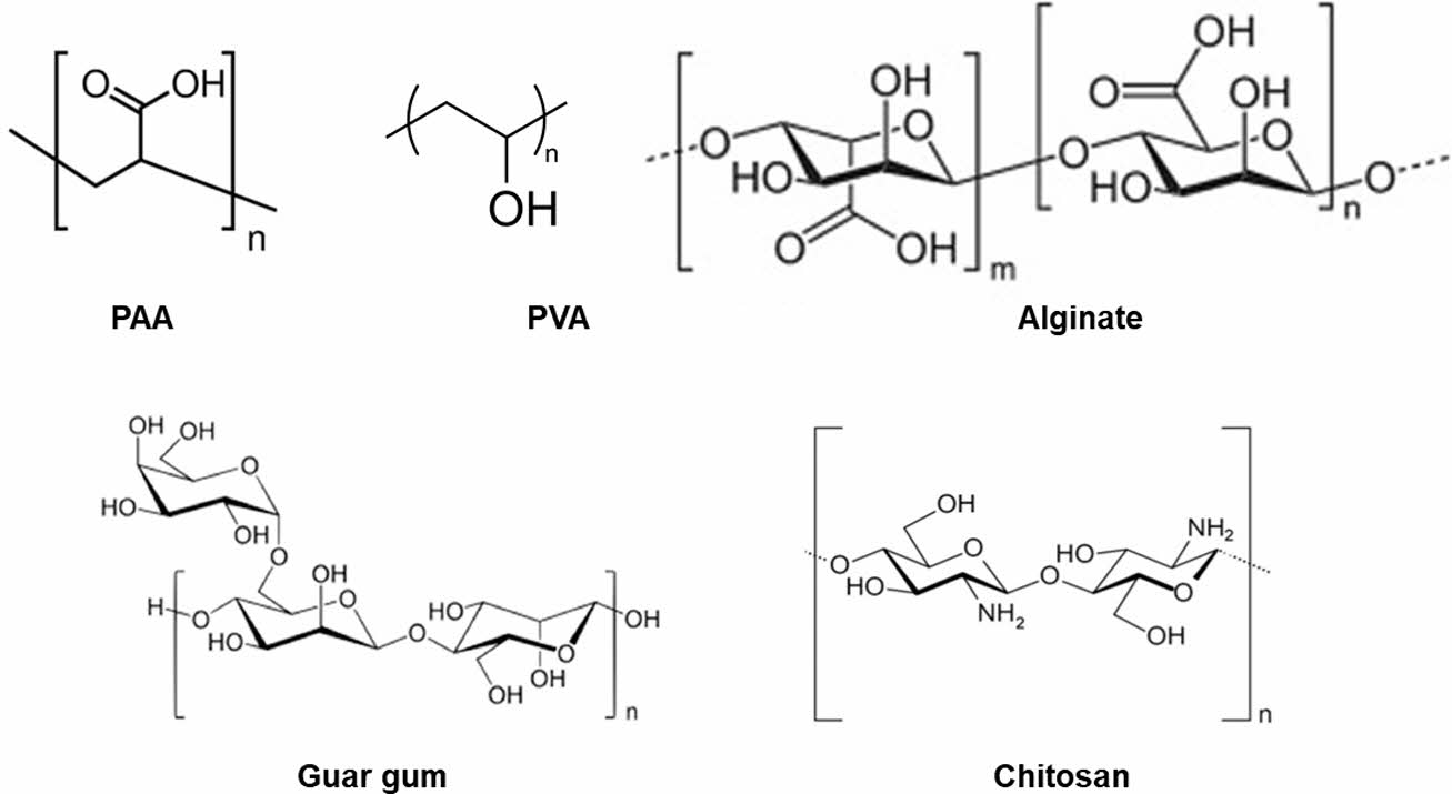 Chitosan은 Chitin(poly(N-acetyl-D-glucosamine)으로부터 얻을 수 있는 biopolymer로 그 양이 매우 풍부한 장점이 있다. Chitosan backbone은 많은 hydroxyl group와 amino group을 가지기 때문에 흑연계 활물질 및 비흑연계 활물질과 높은 접착 특성을 기여할 수 있다[20]. Guar gum은 guar bean에서 추출한 galactose와 mannose로 구성된 다당류로 guar gum의 glycoprotein chain은 실리콘 나노 입자의 부피 팽창을 견디는데 기계적 물성이 우수하여 전지 수명특성 분석 시 500사이클 이후에도 용량 유지율(67%) 및 쿨롱 효율(99%)이 우수한 것으로 보고되었다[21].