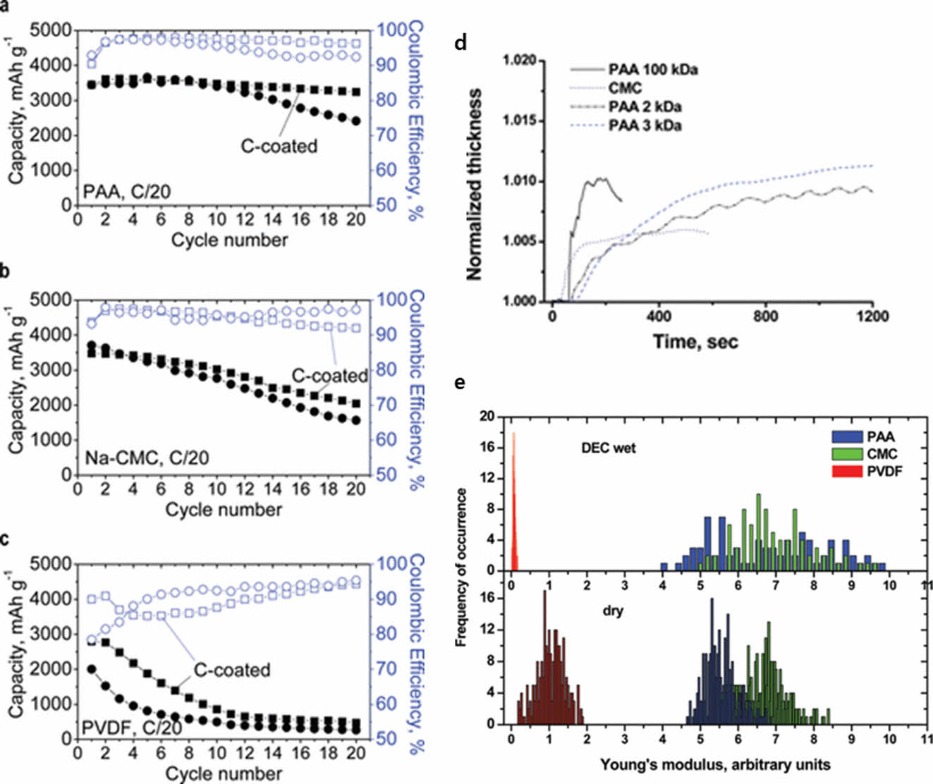 뿐만 아니라 crosslinked-PAA 바인더를 적용하여 실리콘 탈리 개선 효과 확인 등 PAA계 바인더를 활용한 다양한 연구들이 진행되어 실리콘계 음극의 전기화학 수명특성에 많은 개선이 있어 왔다[16]. 하지만 현재 상용화 전지와 비교하였을 때는 추가적인 전기화학 특성이 개선이 필요한 상황이다.