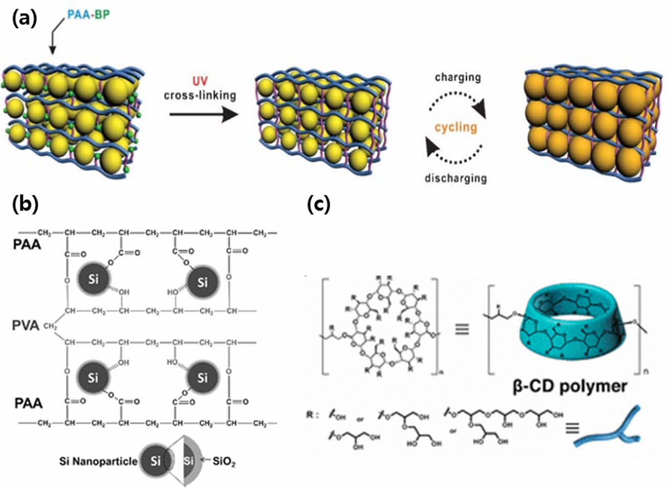 PAA를 기반으로 다양한 고분자 backbone과 cross-linked된 multifunctional type의 바인더들이 연구가 많이 되었다(Fig. 7). Koo et al.연구진에서는 실리콘 음극에 crosslinked PAA/CMC 바인더를 적용함으로써 100 사이클 후 용량유지율이 Si/CMC(41%). Si/PAA(36%), Si/PVDF(3%) 대비 높은 용량유지율(75%)을 보이는 것을 확인하였다[13]. Song et al. 연구진은 PAA/PVA gel network 바인더를 적용하여 Si/CMC(38%), Si/PVA(10%) 대비 전지 수명성능이 개선되는 것을 보고하였다[14]. Choi et al.연구진은 β-cyclodextrin 고분자가 실리콘 계 음극 내에서 가교 구조를 형성함으로써, 전지 구동 시 발생하는 부피팽창을 효과적으로 억제한다는 연구 결과를 발표하였다[15].