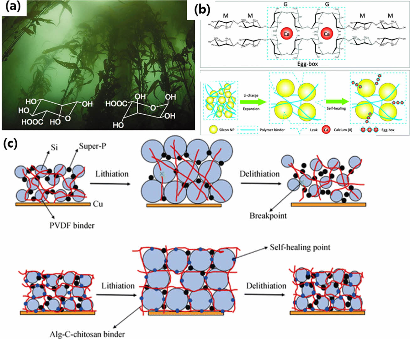 많은 연구진들이 biopolymer에서 유래한 다양한 수용성 고분자 바인더 연구를 진행하였다[17]. 대표적으로 Fig. 8과 같이 Alginate계 바인더에 대한 연구가 많이 진행되었는데, Alginate는 해조류의 세포벽을 구성하고 있는 다당류로 G-block, D-block을 포함하는 공중합체(copolymer)이다. Kovalenko et al. 연구결과(Fig. 9)에 따르면 Alginate 바인더를 실리콘계 음극에 적용하였을 경우 실리콘 입자 표면과 결합을 형성하여 실리콘의 부피팽창을 제어하여 CMC, PVDF계 바인더 대비 우수한 수명 특성을 보이는 것으로 밝혀졌다[18]. 이후 Alginate의 G-block과 금속 양이온(Na-Alg, Ca-Alg, Al-Alg)과의 결합 특성을 응용하여, Fig. 8(b)와 같이 바인더로 적용하여 바인더의 파단강도와 회복 특성을 향상시켰고 이러한 효과로 전지수명성능을 개선시킨 연구들이 보고되었다[19].