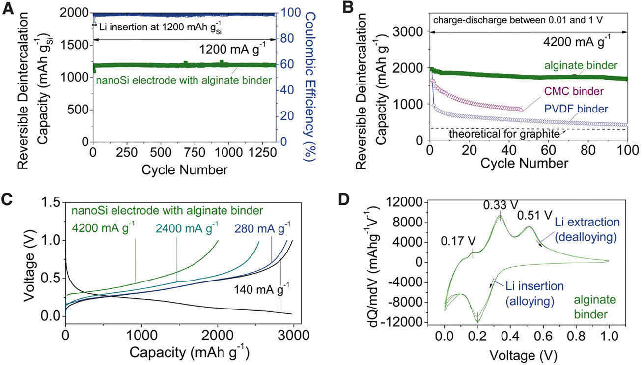 하지만 실리콘과 같은 고용량 음극 활물질의 경우에는 충전 및 방전 과정에서 발생하는 부피변화가 매우 크기 때문에 기존 PVDF계 바인더나 CMC/SBR계 바인더로는 흑연계 음극 수준의 전기화학 수명특성을 구현해내는데 어려움이 있다(Fig. 4). 따라서 이를 개선하기 위해 PAA(polyacrylic acid), PVA(polyvinyl alcohol), Biopolymer(Alginate, Chitosan) 등 높은 기계적 강도를 가지는 수용성 고분자 바인더에 대한 연구가 활발히 진행되고 있다[9-11].
