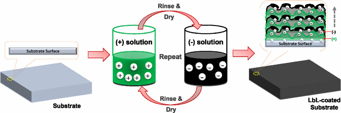다층박막 제작을 위해 우선적으로 기판의 표면을 화학적 처리나 특정 화합물과의 반응을 통하여 전하를 띄거나 이온을 지닌 표면으로 전환시킨다. 그 후, 기판 표면의 전하와 그와 반대되는 전하를 갖는 고분자 전해질의 전하 사이의 정전기적 인력을 이용하여 최초 흡착시킨 뒤, 양전하 고분자 전해질과 음전하 고분자 전해질을 교대로 반복 흡착시켜 다층박막을 제작한다. Fig. 1에서와 같이 만일 박막의 표면이 초기에 음전하로 대전되었다면, 이 박막을 양전하 재료의 용액에 담가 양전하 물질을 정전기적 인력으로 흡착시킨 후, 세정 용매에 다시 담가 약하게 흡착된 양전하 물질을 제거한다. 이때 박막은 강하게 흡착된 양전하 물질로 인하여 표면이 양전하로 대전되게 되며, 이를 다시 음전하 재료의 용액에 담가 음전하 물질을 흡착시킨 후 세정 용매에 다시 세척한다. 이 방법을 지속적으로 반복함으로써 정전기적 인력에 바탕을 둔 다층박막의 제작이 가능하다. 재료의 선택이나 여러 공정 조건에 따라 다층박막의 특성을 다양하게 조절할 수 있는데, pH에 따른 전하밀도 차이에 의한 것이 대표적이다. pH에 따라 전하밀도가 변하는 고분자 전해질을 사용할 경우, pH 및 이온농도를 조절함으로써 고분자 박막의 두께, 표면 모폴로지, 분해 속도까지 조절할 수 있는 고분자 전해질 다층박막을 제작할 수 있다.