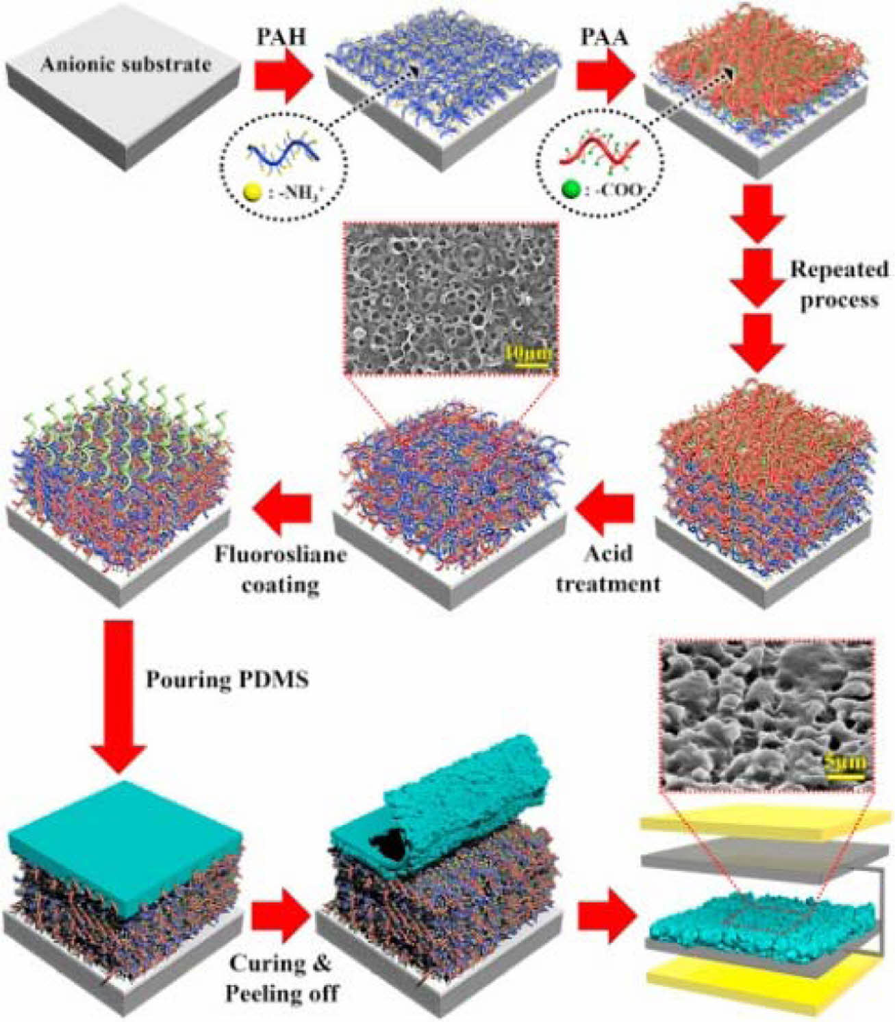Fig. 2 Schematic for the preparation of triboelectric PDMS films with hierarchically embossed structures using porous LbL-multilayered templates [16]. Reproduced with permission from Elsevier (2017) |