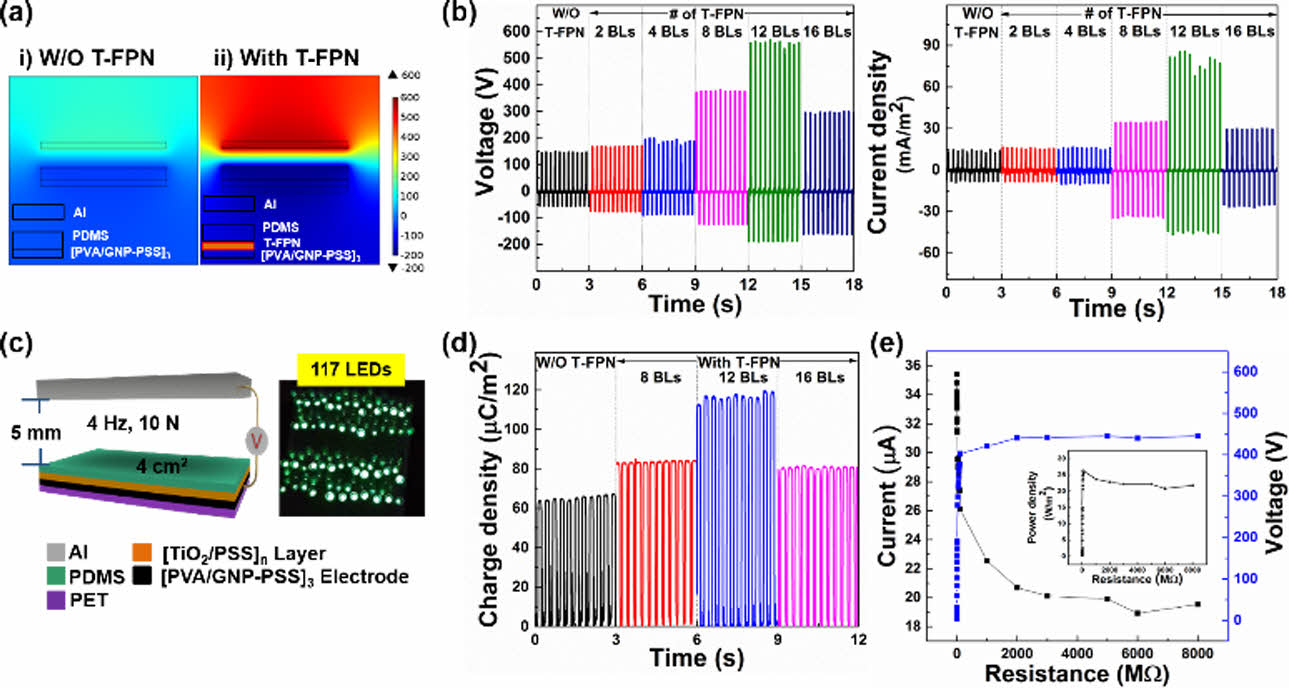 Menge 등은 고도로 변형 가능한 플렉시블 TENG의 성능을 향상시키기 위한 간단하고 손쉬우며 저렴한 공정을 소개하였다. LbL 자기조립을 통해 다층 사이에 기능성 고분자 나노복합체 기능성 층을 삽입 가능하게 하는 기술이다[17]. TENG의 출력 전력을 향상시키기 위해 마찰대전 음극재인 PDMS와 전극 사이에 고유전율 티타늄 산화물(TiO2) 기반 고분자 나노복합체 중간층을 LbL 기술을 사용하여 삽입하였다. LbL 공정을 통해 TiO2 나노입자와 폴리(4-스티렌-술폰산)(PSS)의 다층박막을 역시 LbL 기술로 코팅한 그래핀 기반의 TENG용 전극 위에 적층하였다. 수용액 상태에서 음전하를 갖는 TiO2 나노입자와 양전하를 띄는 PSS 고분자 사슬이 정전기적 인력을 통해 그래핀 전극 위에 차례대로 적층되었다. 표면 분석을 통해 TiO2 나노입자 층이 적층되어 있음이 확인되었고, 기존의 플렉시블 특성도 유지됨을 확인하였다. 최적의 성능을 위해 다양한 층수로 적층하여 LbL 기술로 개선된 마찰대전 출력성능을 비교하여 본 결과, 12층의 [TiO2/PSS] 다층박막을 삽입한 TENG의 출력 성능이 기능성 필름을 삽입하지 않았을 때보다 출력 전압이 약 3.8배, 출력 전류밀도가 5.7배 높았다(Fig. 3). 이는 기능성 TiO2 다층박막의 효과인 전하 누출의 감소, 표면 전하 밀도의 유지, 향상된 분극성으로 인한 마찰대전 성능의 향상 때문이다.