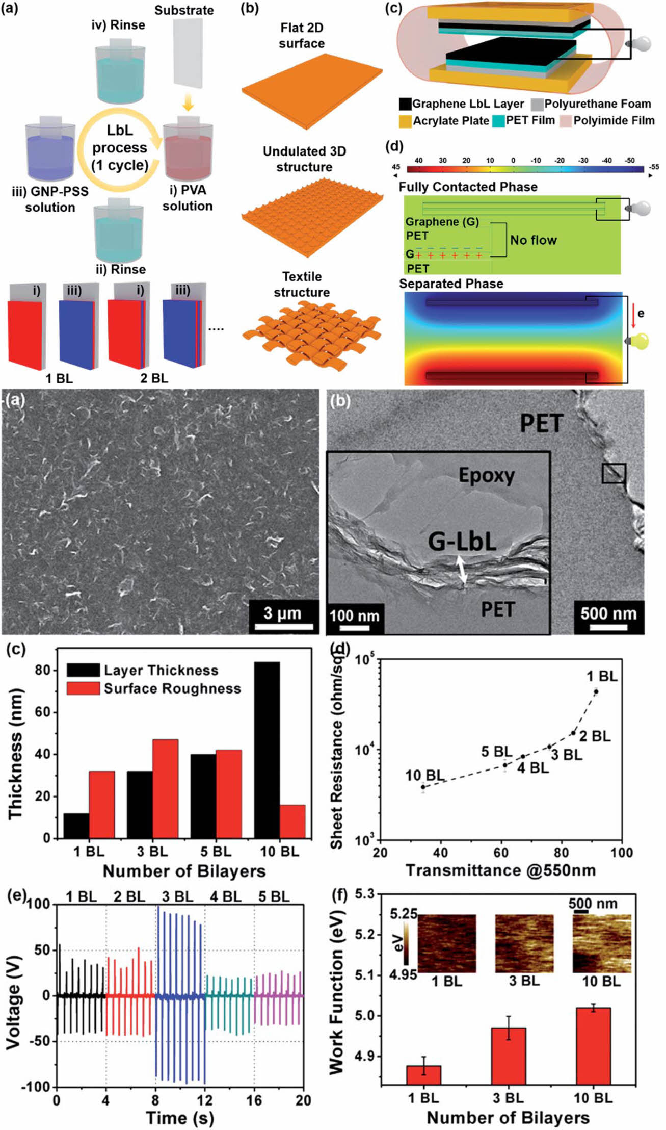Guo 등은 접촉 대전이 고분자 전해질 필름에 의해 어떻게 제어될 수 있는지 처음으로 조사했다[18]. 해당 연구에서 선택한 기판은 전자 패키징 산업과 마찰전기 나노발전기 모두에서 사용되는 폴리이미드(Kapton)이다. Chung 등은 폴리(4-스티렌-술폰산)(PSS)으로 분산시킨 그래핀 나노판(GNP)으로부터 LbL 자기조립 기법을 사용하여 유연한 그래핀 기반의 초박형 마찰대전 소재를 개발하였다[19]. 폴리비닐알코올(PVA)은 LbL 자기조립에서 그래핀 용액에 대응하는 재료로 중요한 역할을 합니다(Fig. 4). 그래핀의 수중 분산에 효과적인 것으로 알려진 PSS는 그래핀의 표면 전하를 증가시켜 그래핀의 분산 및 표면 접착력을 향상시키는 데 사용되었다. PVA 및 PSS는 수소 결합을 통해 LbL 다층박막의 성장을 유도하였고, 이를 통해 원하는 층수의 다층박막이 제작되었다. LbL 기술로 증착한 그래핀 다층은 높은 내구성과 고성능을 가진 그래핀 기반의 마찰대전 재료로 사용되었다. 이러한 성장 경향은 앞서 기술한 여러 박막 특성 분석 기법(예를 들면, 타원편광 반사법, 수정진동자 저울, 자외선 및 가시광선 분광법 등)을 통하여 필름 내에서 PVA와 그래핀의 성공적인 조합과 일정한 조성을 확인하였다. 1, 3, 5 및 10 층수 등 다양한 샘플들 중에서 흥미롭게도 3개의 그래핀 층이 포함된 TENG에서 100 V의 최대 출력 전압과 5 mA의 최대 출력전류를 보여주었다. 이는 적절한 형태학적 특성 및 전기적 특성 때문으로 판단된다. 마지막으로, 섬유 위에 코팅된 그래핀 다층박막은 단일 전극 모드에서 작동하는 착용 가능한 섬유 기반 TENG로도 제작되었다.