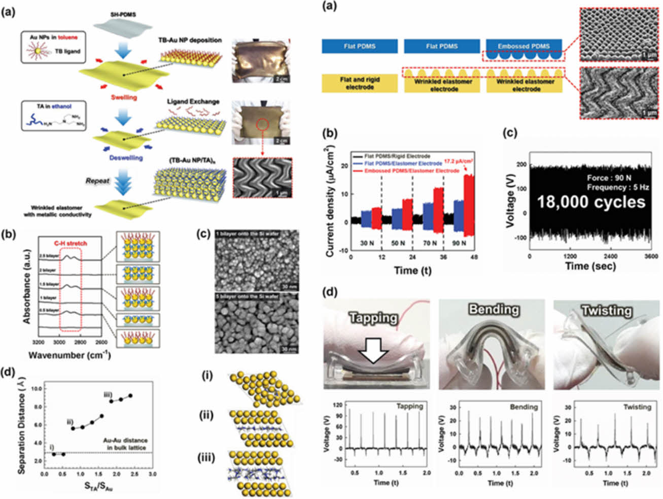 Lee 등은 용매 팽윤과 금속 나노입자 기반의 LbL 자기 조립 기법을 통해 벌크 금속과 같은 전도성, 높은 전기적 안정성, 큰 전극 표면을 갖는 주름진 탄성체를 다른 추가 처리 공정 없이 제작하여 보고하였다[20]. 이 연구에서는 테트라옥틸암모늄 브로마이드(TB)로 안정화시킨 후 톨루엔에 분산시킨 직경 7±3 nm의금 나노입자와 에탄올에 용해된 트리스(2-아미노에틸)아민(TA, (NH2CH2CH2)3N)을 두 재료로 하여 티올(SH)로 기능화된 PDMS 기판 위에 적층하였다. LbL 공정은 두 재료 간 리간드 교환으로 진행되고, 이 과정에서 금 나노입자의 표면에 느슨하게 결합된 부피가 큰 TB 리간드가 다음에 오는 TA 링커의 NH2 그룹으로 교체된다. 이 교환은 TA의 1차 아민 그룹이 TB 리간드의 암모늄 그룹보다 금 나노입자의 표면에 대해 더 높은 친화도(공유 결합에 의해)를 갖기 때문에 발생한다(Fig. 5). 이렇게 제작한 탄성체 전극 기반 TENG(즉, 탄성체 전극/굴곡진 PDMS-TENG 및 탄성체 전극/평평한 PDMS-TENG)은 전기 출력에서 평평하고 단단한 전극 기반 TENG(즉, 단단한 접촉 전극/평평한 PDMS-TENG)보다 뛰어난 성능을 보였다. 탄성체 접촉 전극이 양각의 굴곡진 PDMS 플레이트와 결합되었을 때 결과 TENG 장치의 전기 출력은 18,000 사이클 동안 안정적인 전기 출력으로 최대 198 V 및 17.2 μA cm-2까지 크게 증가하여, 동일한 실험 조건에서 단단한 접촉 전극을 기반으로 한 TENG의 성능을 능가하였다. LbL 자기조립으로 제작한 주름진 탄성체 전극을 기반으로 하는 마찰전기 나노발전기는 주기적인 접촉과 분리 동안 주름진 표면의 압축성, 큰 접촉 면적으로 인해 우수한 발전 성능을 나타냈다. Fig. 6 Fig. 7