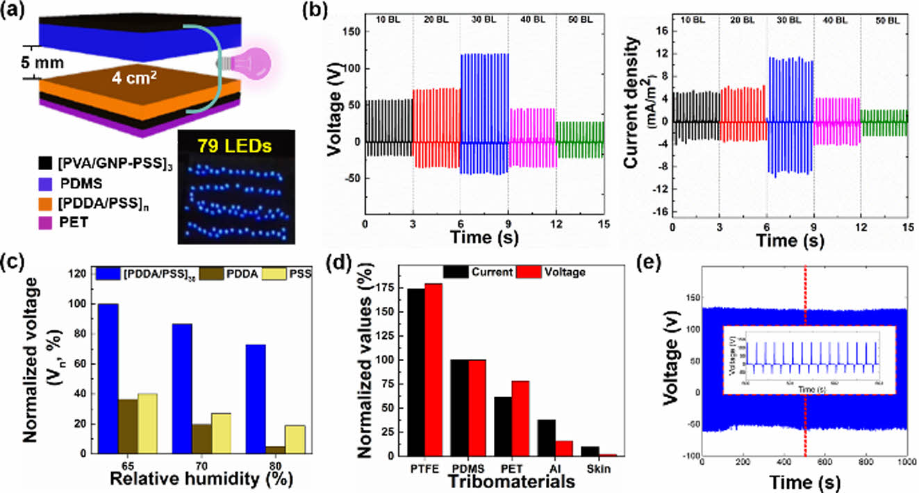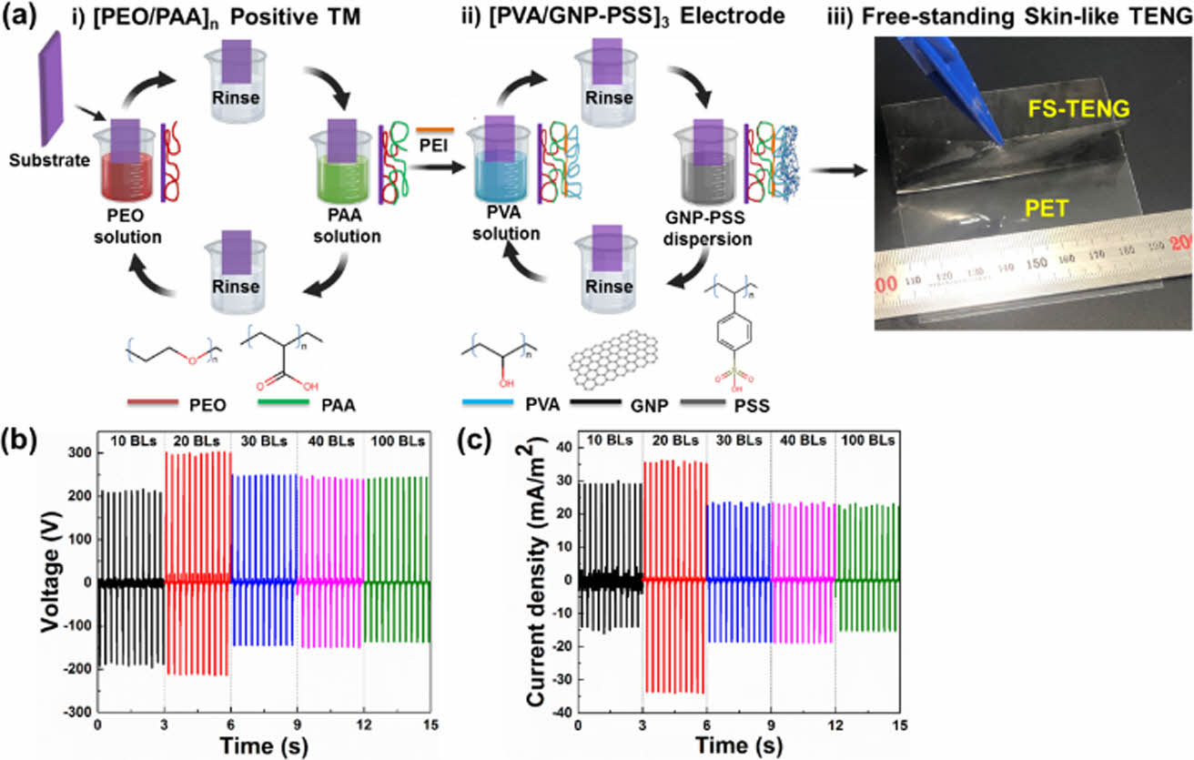 Jo 등은 정전기적 인력을 통한 LbL 자기조립 제조 기술을 이용하여 양전하 고분자 전해질인 폴리(디알릴디메틸암모늄 클로라이드)(PDDA)와 음전하 고분자 전해질인 폴리(4-스티렌-술폰산)(PSS)의 복합 다층박막을 제작하였다[9]. 손쉽고 저렴하게 제작된 이 초박형 다층박막은 마찰대전 양극 재료로 잠재적인 가능성이 있다. LbL 기반의 마찰대전 재료를 이용한 기존의 다른 TENG와 같이 전기 출력 성능은 다층박막의 층수에 따라 변화하는 특성을 보였으며, 30층의 [PDDA/PSS] 다층박막을 양극 재료로 사용한 경우 최적화된 출력 성능을 보여주었다. 또한, 30층의 [PDDA/PSS] 다층박막을 사용한 TENG는 상대습도 65%의 열악한 환경에서 189 V의 상당한 전압과 17 mA m-2의 전류 밀도를 보여 LbL 자기조립 다층박막 기반의 TENG 장치의 지속 가능성을 보여주었다. 또한 최적화된 TENG의 단일 전극 모드는 215 V 및 79 mA m-2의 인상적인 TENG 성능을 나타내었다.