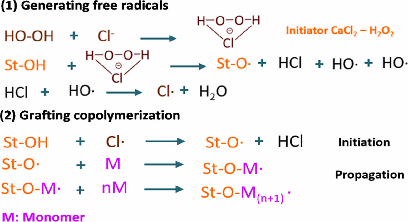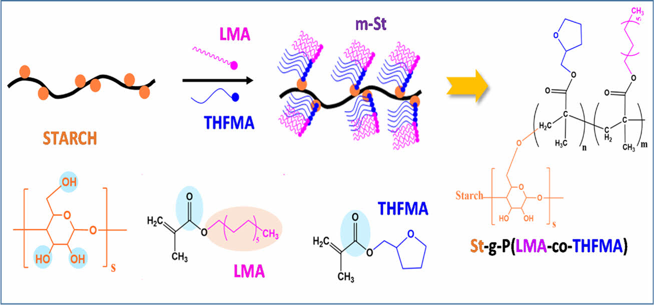 One of the essential techniques for modifying the physical and chemical properties of St is chemical modification, and an efficient way to modify the physicochemical properties of starch is by graft copolymerization. This alternative method improves several properties of starch by structural alternation and producing new functional groups [6].