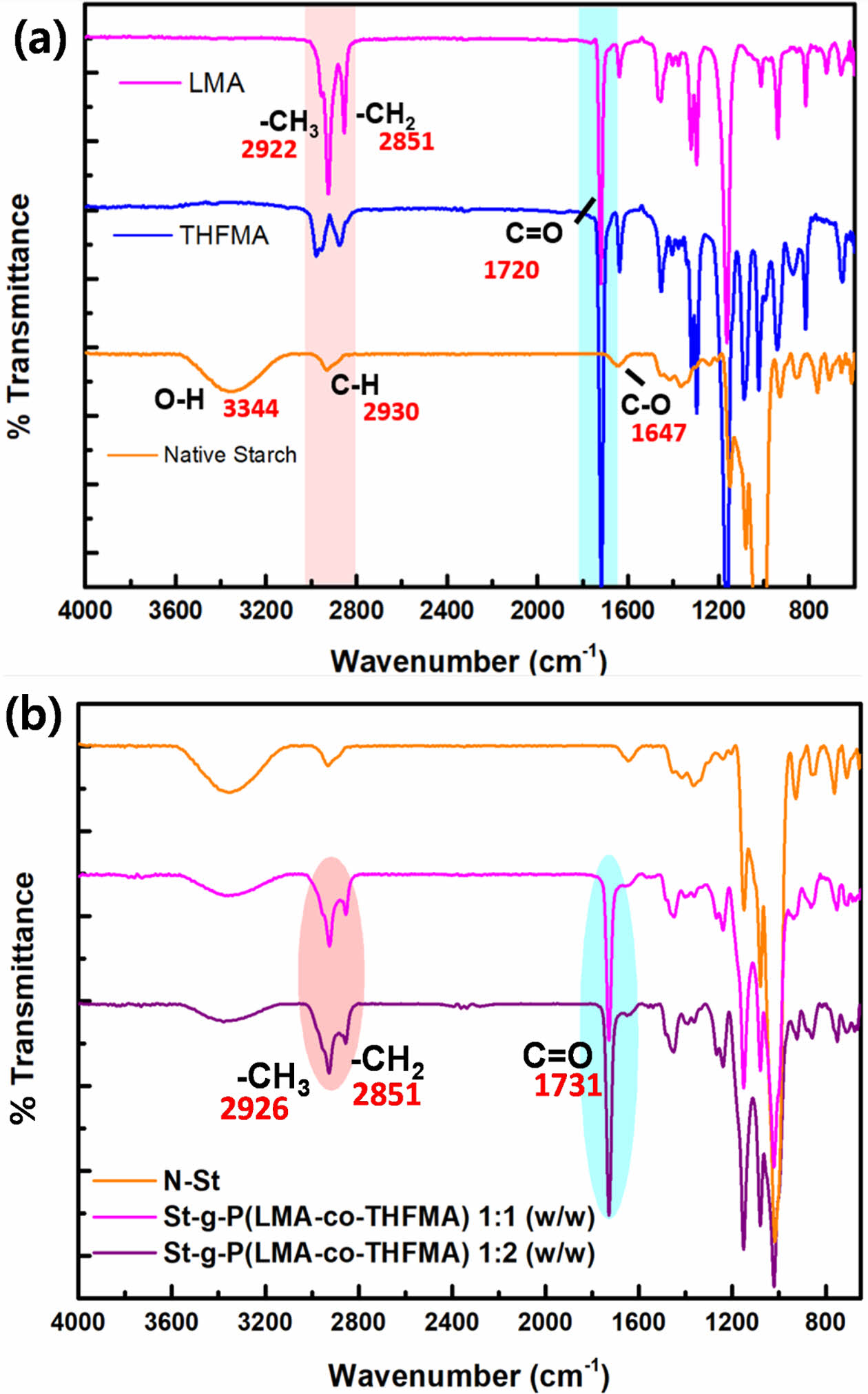 As shown in Fig. 3(a), FTIR spectra of the native starch indicated the characteristic absorption peaks of the starch backbone; the hydroxyl group OH- around 3344 cm-1 stretching and vibration of the hydrogen bond, 2930 cm-1 corresponding to the C-H asymmetrical stretching and vibration, CO-1647 cm-1 and CH/CH2-1050 cm-1 wavenumber [15]. For the two acrylate monomers employed, lauryl methacrylate peaks around 2922 and 2851 cm-1 wavenumber are attributed to the methyl, CH3 and methylene, CH2 of its long chain and the absorption peak around 1100 cm-1 is due to the stretching vibration of C-O-C in the THFMA. Moreover, for both LMA and THFMA, the characteristic prominent peak around 1720 cm-1 is attributed to the carbonyl group (C=O).