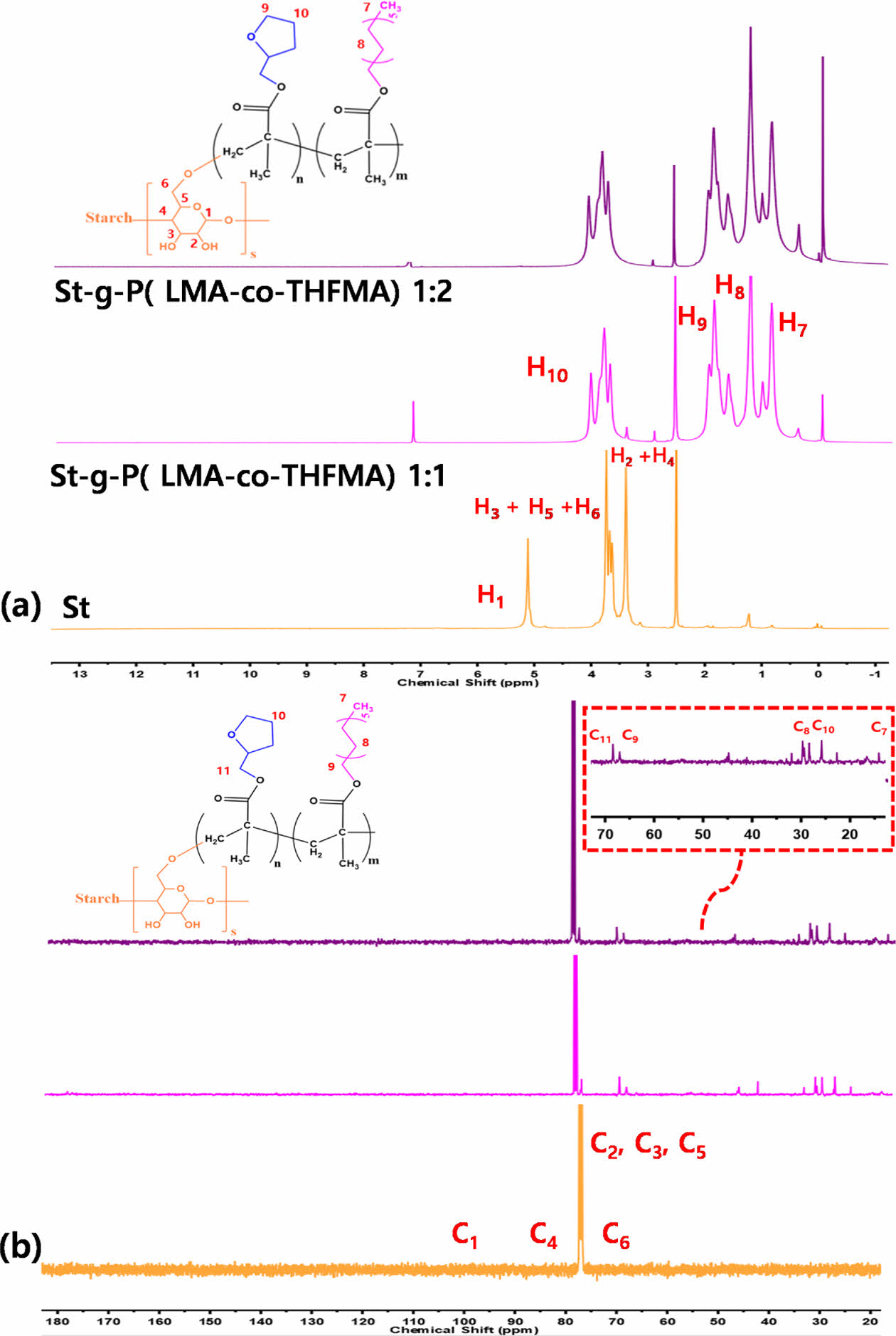 Besides FT-IR characterization, both 1H NMR and 13C NMR spectra were also performed to confirm the graft polymerization of starch (Fig. 4). The 1H NMR results are shown in Fig. 4(a). The chemical shifts between 5.0 and 6.0 ppm attributed to the vinyl protons of LMA and THFMA, thus are not observed in the 1H NMR spectrum of m-starch, confirming the grafting polymerization onto the starch backbone. The chemical shift at 1.25 (1-2) ppm corresponds to the methylene protons of LMA. The methine (CH) and methylene (CH2) protons in the tetrahydrofurfuryl ring and methylene protons near the ester bond in the THFMA and LMA show overlapping signals in the range of 1-4 ppm.