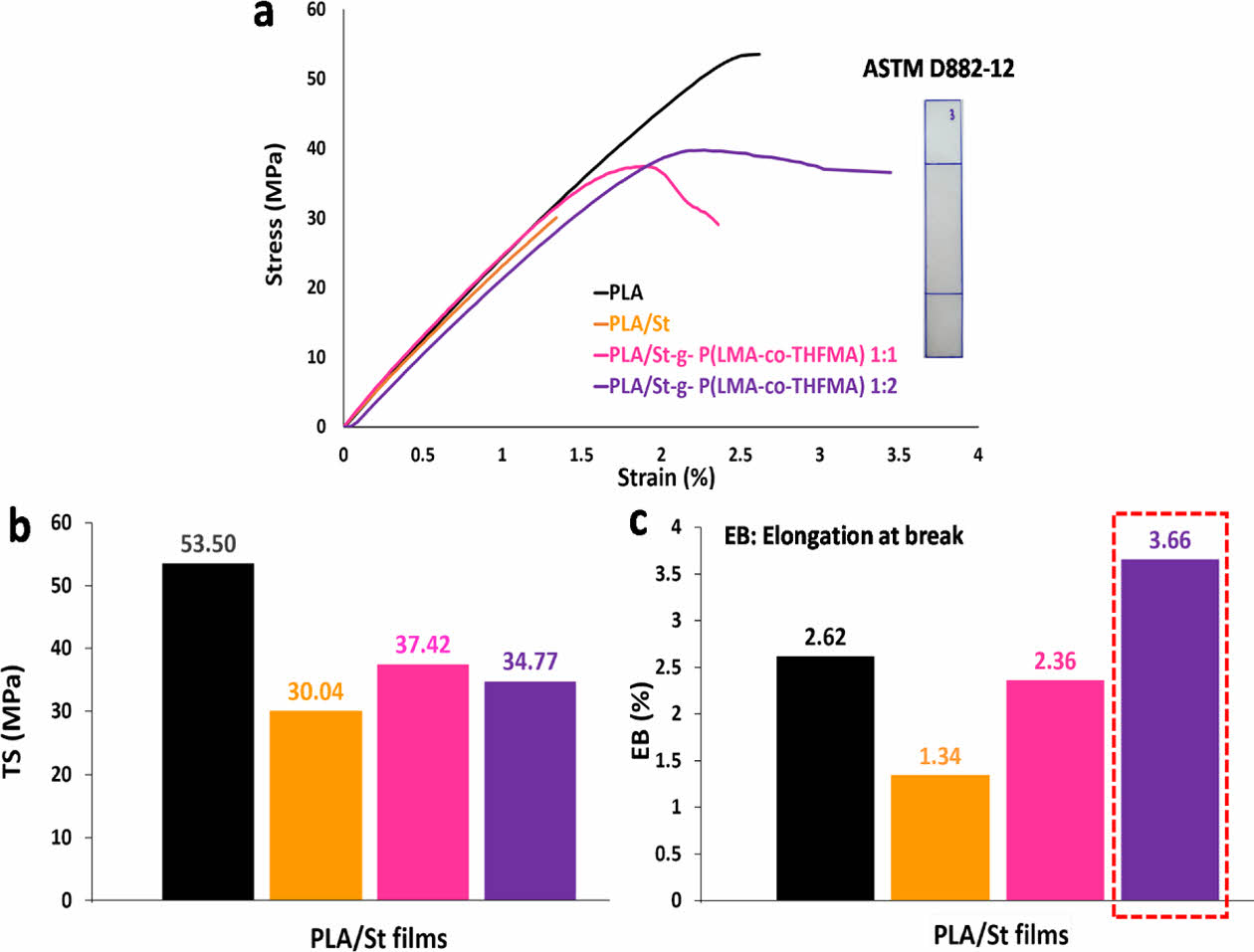 The mechanical properties of bulk PLA and PLA/St films were evaluated. The tensile strength and elongation at break of PLA, PLA/St, PLA-g-P(LMA-co-THFMA) 1:1, and PLA-g-P(LMA-co-THFMA) 1:2 composites are exhibited in Fig. 7(a)-(c).