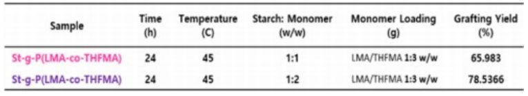 In this study, we reported starch copolymerization with biobased acrylate monomers, lauryl methacrylate (LMA), and tetrahydrofurfuryl methacrylate (THFMA) via chemical graft polymerization to improve processability and compatibility between hydrophilic starch and hydrophobic polymers (Fig. 1). Table 1