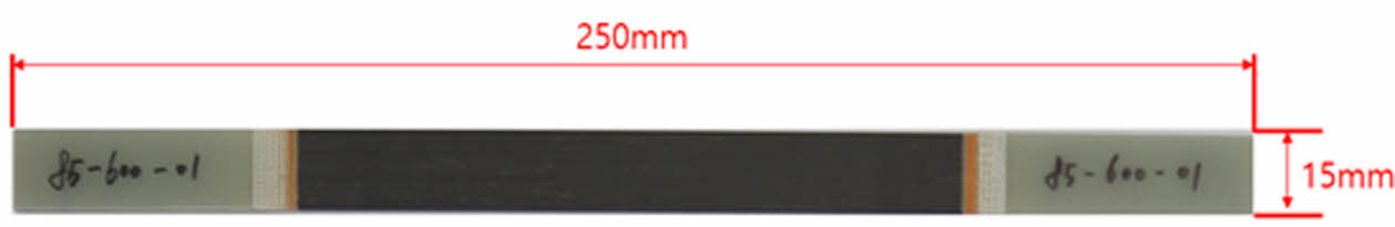 수소버스용 내압용기 복합재의 모사를 위해 압력용기용 탄소섬유(효성, H2550-24K)와 121oC의 유리전이온도를 갖는 에폭시 수지(LOCTITE EA 9695 AERO)를 사용하여 0°의 적층 각도를 갖는 탄소섬유 복합재를 제작하였다. Fig. 3과 같이 폭 15 mm, 총 길이 250 mm, 두께 1.1~1.2 mm의 시편 양 끝단에는 1.6 mm 두께의 탭(tab)을 에폭시 본드로 부착하여 인장 물성을 평가하였다. 장시간 열적환경 노출에 따른 복합재의 기계적 특성을 평가하기 위해 드라이 오븐을 사용하여 85oC, 95oC, 105oC, 115oC의 4가지 온도에서 각각 600시간, 800시간, 1,000시간 동안 유지하였다. GTR No. 13 시험기준으로 수소버스용 용기 내부의 고온 정압 시험 시에는 875 bar의 압력을 가해야 하나, 샘플 단위 복합재의 열적환경 노출 시에는 별도의 하중을 부과하지 않았다. 본 연구에서는 인장시험 시 복합재에 가해지는 응력을 내압에 대한 기계적 하중으로 고려하여 우선적으로 노출 온도와 시간에 대한 고찰을 진행하였다.