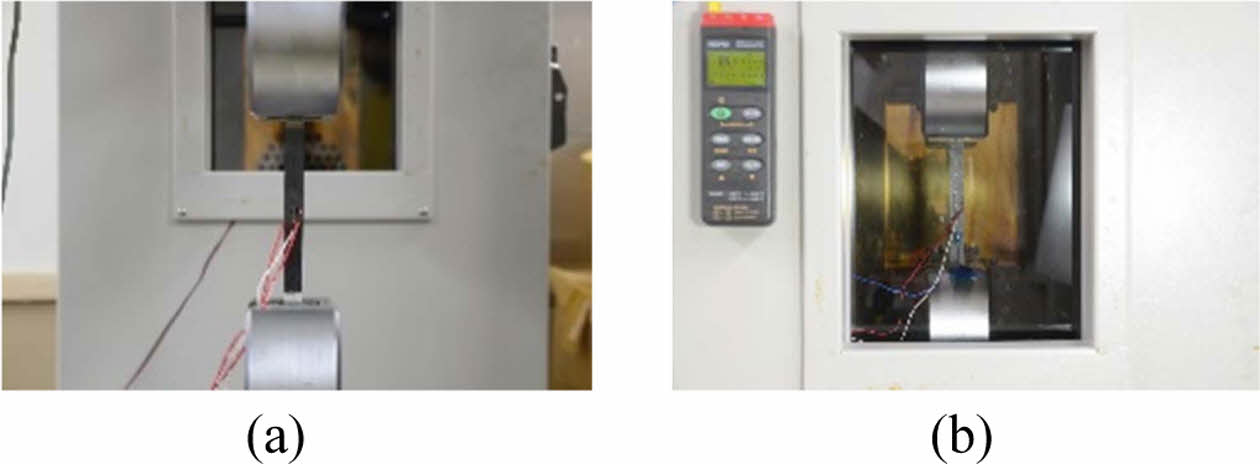 Fig. 4 Exposure environment for tensile test: (a) room temperature and (b) thermal environment in oven |