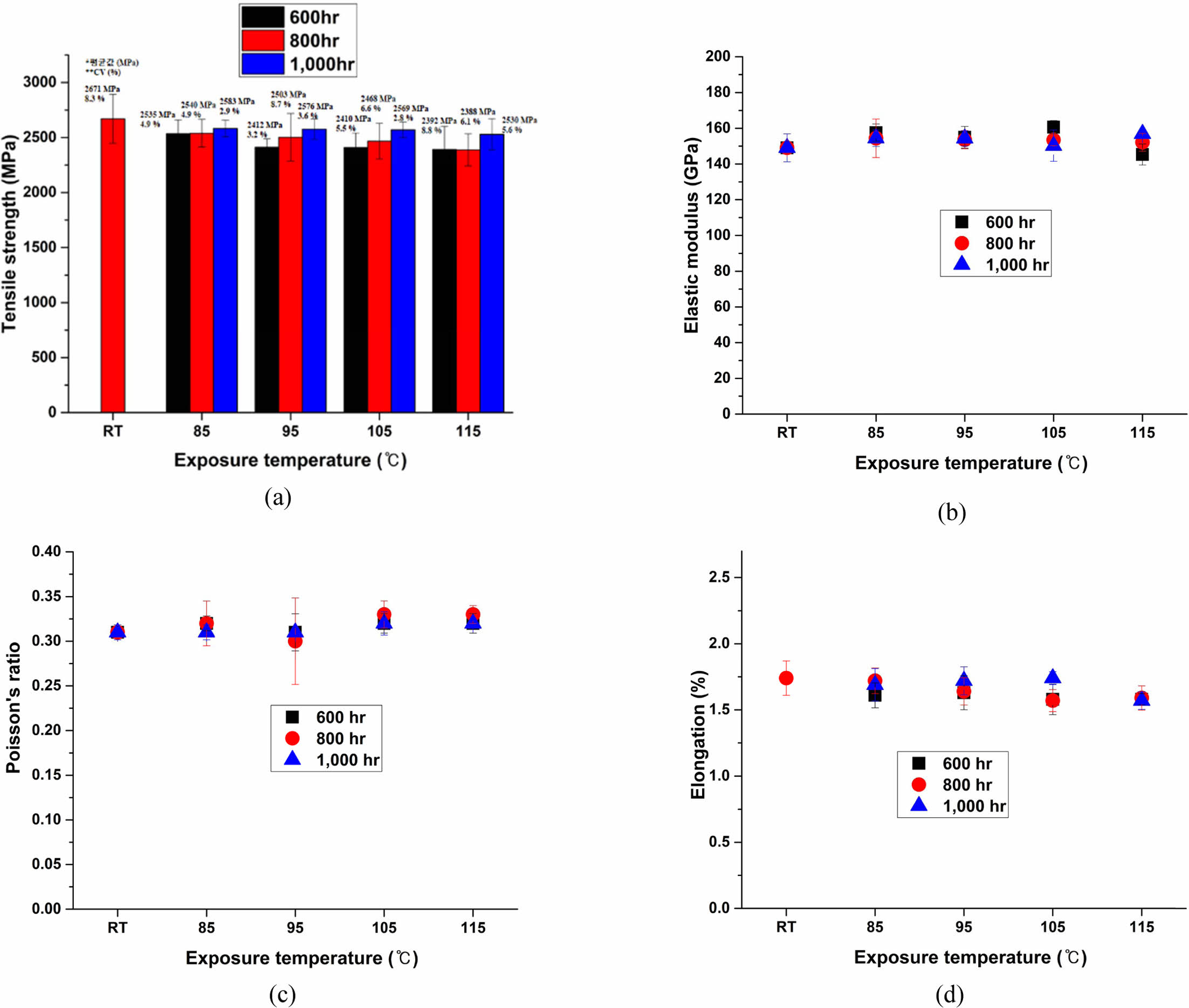 유리전이온도는 실제로 특정온도가 아닌 온도 범위이며, 따라서 본 실험의 복합재 노출온도 환경에서는 에폭시 수지의 유리전이온도인 121oC에 근접할수록 복합재의 인장강도는 감소하는 것으로 판단된다. Table 1과 Fig. 5(a)를 바탕으로 노출시간과 연계하여 살펴보면 노출온도가 증가할수록 인장강도의 완만한 감소가 나타난다. 600시간에서는 노출온도가 증가할수록 최대 5.4%의 인장강도 감소폭을 나타내며, 800시간에서는 5.7%, 1,000 시간 유지시에는 2.0%의 감소폭을 보인다. 또한 본 연구의 노출시간 조건인 600시간부터 노출시간이 증가할수록 복합재의 인장강도가 다시 상승하는 것을 확인할 수 있다. 인장강도의 상승은 수지의 후경화와 관련이 있다. 후경화는 경화된 수지를 경화 온도 이상에서 장기간 노출시키면 강도 증가, 유리전이온도 상승, 잔류 응력 등이 감소되는 것으로 알려져 있다. 이는 미반응 에폭시 수지가 장기간 노출에 따른 경화에 참여하면서 복합재의 인장강도가 상승하는 것으로 판단할 수 있다[12,13]. 본 연구에서 사용된 복합재의 노출온도 및 시간 조건에 따른 탄성계수, 포아송비 및 연신율은 Fig. 5(b), (c), (d)와 같이 물성의 변화에 차이가 거의 없으며, 이는 고온 정압 시험 시 시간 단축에 대한 신뢰도의 변화에도 큰 차이를 보이지 않을 것으로 예측할 수 있다.