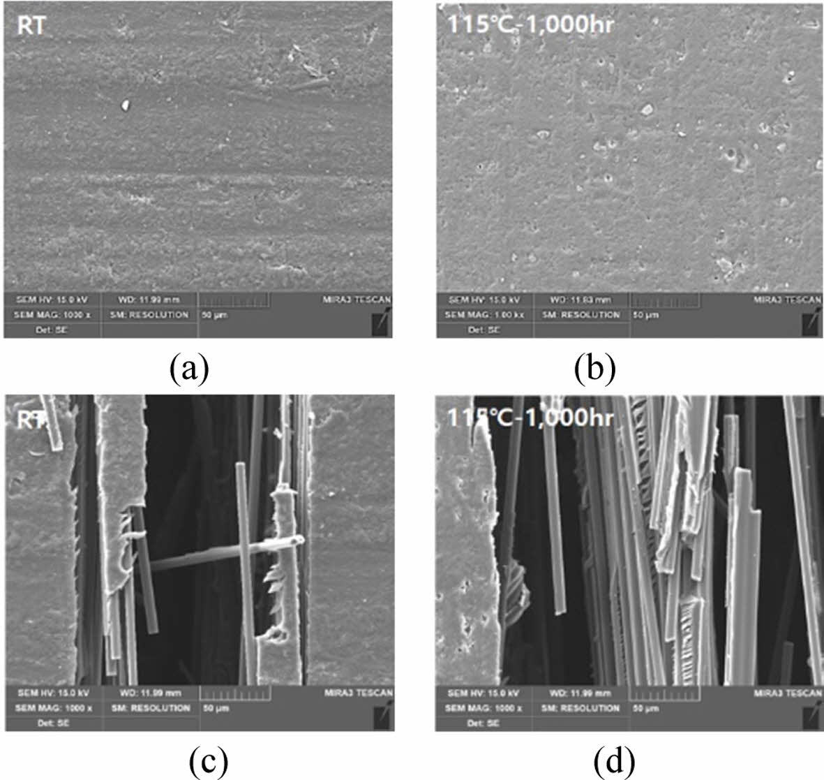 Fig. 7은 노출 전후 복합재 표면 및 파단형상을 SEM(주사전자현미경)으로 관찰한 것이다. 노출되지 않은 복합재 표면과 열적환경에 노출된 표면의 큰 차이는 없으며 일부 영역에서 매끄럽고 거친 표면의 차이는 존재한다. 하지만 Fig. 7(b)와 같이 115oC에서 1,000시간 동안 노출되었을 때는 표면의 에폭시 수지가 덩어리 형태로 뭉쳐 있고 표면에 기공이 존재한다. 조대한 기공은 복합재 표면에 뭉친 수지 덩어리의 탈락으로 인해 발생하며, 미세 기공은 복합재 표면의 수지가 불충분한 지역에서 발생하는 것으로 판단할 수 있다[14-20]. 복합재 표면은 수지로 덮여 있고, 내부에는 탄소섬유와 수지의 혼합층이 존재한다. 따라서 내부의 탄소섬유 층간, 내부의 탄소섬유층과 외부의 수지층 사이에는 층간 전단 응력이 존재한다. 따라서 Fig. 7(c), (d)와 같이 탄소섬유 계면의 수지에 물결무늬 파단 형상이 다수 관찰된다. 본 연구에서는 파단면 형상으로는 열적환경 노출에 따른 차이를 구분하기 어려우나, 노출되지 않은 복합재에서는 섬유와 수지 계면이 상대적으로 깨끗하고 장시간 노출된 복합재에서는 Fig. 7(d)와 같이 층간 전단에 의한 수지 계면에서의 파단면이 관찰되었다.