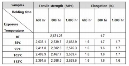 Table 1은 각각의 열적환경 분위기에서 복합재 시편의 인장강도 및 연신율 측정 결과를 나타낸다. 상온에서의 인장강도는 2,671 MPa로 측정되었으며, 노출 600시간을 기준으로 85oC에서 2,535 MPa, 95oC에서 2,412 MPa, 105oC에서 2,410 MPa, 115oC에서 2,392 MPa로 점점 감소한다. 800시간 및 1,000시간동안 노출시킨 복합재의 인장강도 또한 동일한 거동을 나타낸다. 노출온도 증가에 따른 복합재의 인장강도 감소는 에폭시 수지의 열적, 기계적 물성과 관련이 있는 것으로 보인다.에폭시 수지는 탄소섬유에 비해 낮은 강도를 갖고 있어 복합재에 응력을 가하면 수지에 우선적으로 하중이 전달된다. 복합재에 가해지는 하중을 고르게 분산 및 전달하는 역할인 에폭시 수지는 온도가 증가할수록 약간의 연화가 진행된다. 또한 복합재의 탄소섬유 적층 방향이 0°일 때는 고온환경에서 탄소섬유가 온도에 큰 영향을 받지 않으며, 수지의 유리전이온도 부근 또는 이상일 때는 수지의 상변화 및 열 손실로 인해 섬유/수지간 계면에서의 접착력 저하로 인장강도가 떨어지는 것으로 알려져 있다[11].
