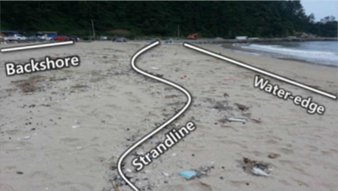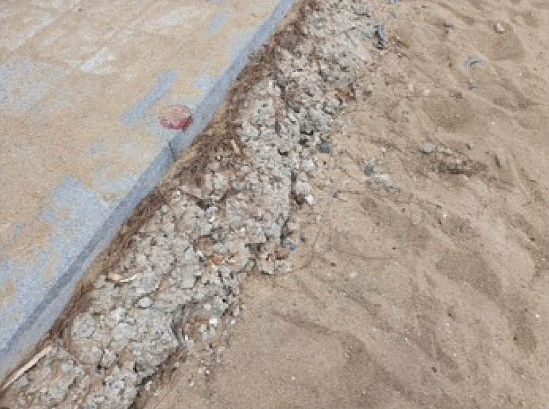 해안가 미세플라스틱 입자의 정보를 얻기 위해 전국 해안 총 21개소의 해안가를 방문하여 현장조사를 수행하였다. 일반적으로 해안가 백사장의 경우 후안(Backshore), 표착선(Strandline), 해안 근접선(Water-edge)으로 구분된다. 이때, 후안은 해안가와 전안(foreshore)의 경계인 해변 모래의 최후방을 의미한다. 해안근접선은 저조 때 가장 바다방향으로 표면에 마른 모래가 위치한 곳을 말한다. 표착선은 후안과 해안 근접선 사이에서 쓰레기가 가장 많이 위치한 곳을 말한다. 현장조사 결과 Fig. 1과 같이 표착선에서 가장 많은 양의 플라스틱 분포를 확인할 수 있었다. 특히, Fig. 2와 같이 풍랑에 의해 후안에 밀집되어 있는 플라스틱을 확인할 수 있었다.