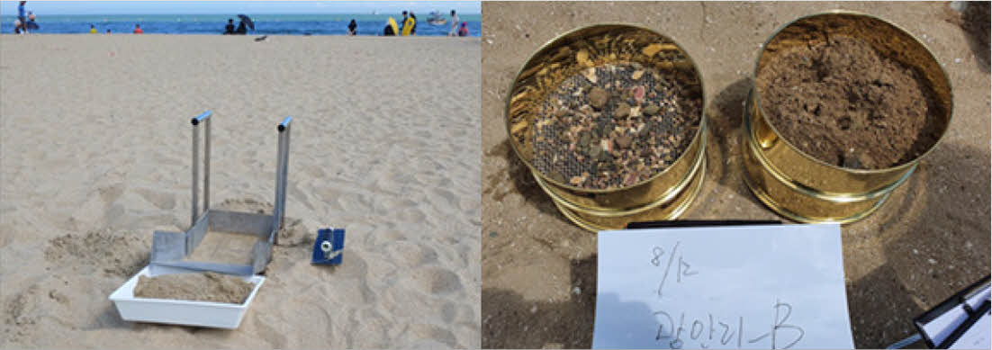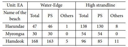 Table 1은 미세플라스틱이 다량 검출된 주요 해변의 미세플라스틱 분포결과이다. 결과는 채취한 시료의 부피인 0.009 m3에 포함된 모래와 미세플라스틱 입자를 체가름 시험을 통해 산출된 미세플라스틱의 개수이다.