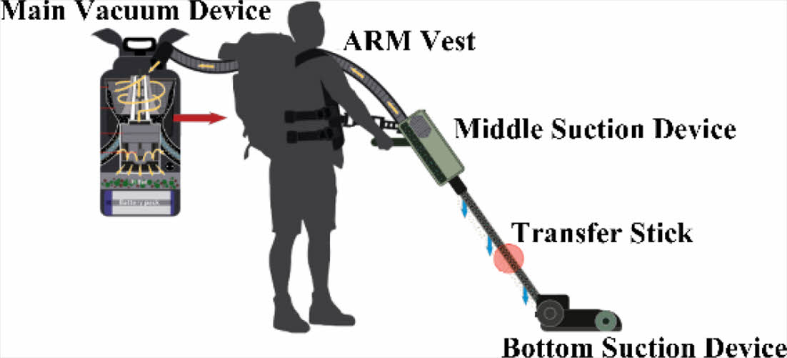 Fig. 4는 휴대형 미세플라스틱 수거장비 개념도이다. 휴대형 미세플라스틱 수거장비는 사람이 직접 휴대하여 이동하며 해안가의 미세플라스틱을 수거할 수 있는 장비이다. Fig. 4에서 보이는 바와 같이 본 장비는 크게 다섯가지 주요 부품인 주 진공 장치(main vacuum device), 휴대 보조 장치(ARM vest), 흡입 및 진공 발생 장치(middle suction device), 연장 및 이동 관(transfer stick), 하부 흡입 장치(bottom suction device)로 구성된다. 주 진공 장치는 싸이클론 장치(cyclone device)를 탑재하여 수거장비의 진공환경을 형성하고, 수거된 모래와 미세플라스틱을 분급하는 분급기가 위치한 부품이다. 휴대 보조 장치는 주 진공 장치에 부착되어 운용자가 장비를 휴대할 수 있도록 보조하는 부품이며, 흡입 및 진공 발생 장치는 모래 및 미세플라스틱 수거를 위해 진공을 형성하는 부품이다. 연장 및 이동 관은 하부 흡입 장치에서 수거된 1~5 mm 입자를 흡입 및 진공 발생 장치로 이동시키는 통로 역할을 하는 부품으로써, 배터리 잔량 및 미세플라스틱 흡입량 장비 출력 등을 확인할 수 있는 디스플레이가 부착되어 있다. 마지막으로, 하부 흡입 장치는 직경 5 mm 이상의 입자의 진입을 방지하고, 흡입구 부분에 중량을 부가하여 입자의 원활한 유입을 보조하는 부품이다.