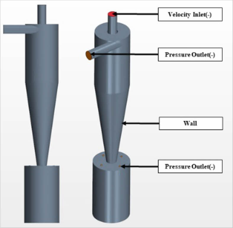 Fig. 6에서와 같이 경계조건으로는 수거장비의 입구 즉, 모래 및 미세플라스틱이 흡입되는 흡입부는 압력조건으로, 배출부는 초기 제작품의 흡입시험에 근거한 속도조건을 지정하였다. 또한 모래만 분리되어지는 하부공간의 와류형성을 위한 미세구멍(Turbulence-Hole)을 재현하는 압력조건을 지정하였다. 출구에서의 흡입속도는 12.5 m/s이며, 입구에서 입자속도는 형상에 의하여 감속되어지는 출구 흡입속도로 입자가 주입되어진다. Table 2는 수치해석 시 반영된 모래 및 폴리스타이렌 입자 물성치 정보를 보여준다. 앞장에서 언급한 바와 같이 시료채취에 의한 미세플라스틱의 대표 입자는 폴리스타이렌으로 모래와 같이 입구에 주입하였다.