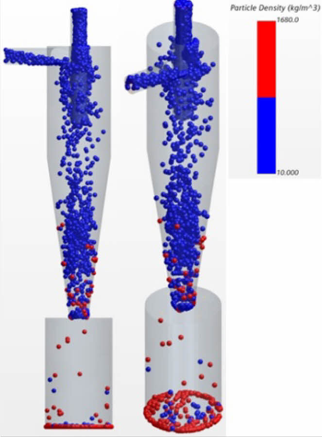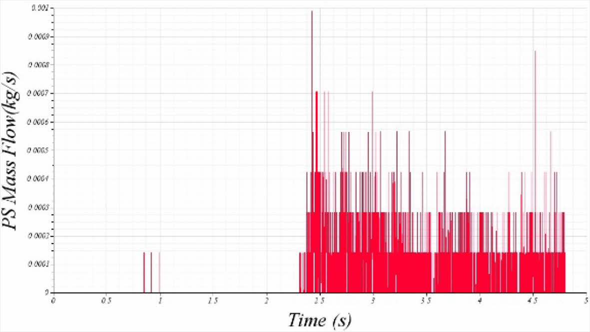 Fig. 7은 수거장비의 출구에서의 폴리스타이렌의 토출량 결과를 보여주고 있다. 입구에서 주입된 모래 및 폴리스타이렌은 수거장비의 싸이클론 장치내에서 대다수 분급되며 모래는 아래로 낙하하고, 폴리스타이렌은 출구로 토출되어진다. 입구로 주입된 입자는 출구까지 거쳐가는 약 2.2초간의 시간 이후 출구로 지속적으로 도출되는 것을 알 수 있었다. 2.5~4.초까지 주입 및 토출된 폴리스티렌 양은 각각 0.2 kg 및 0.176 kg으로서 주입대비 토출되는 비율은 약 88%로 확인되었다. Fig. 8은 싸이클론 장비 내 입자의 거동을 보여주고 있으며, 빨간색으로 표현된 모래입자는 아래로 낙하하여 쌓이며, 폴리스타이렌은 출구로 토출되는 것을 확인하였다.
