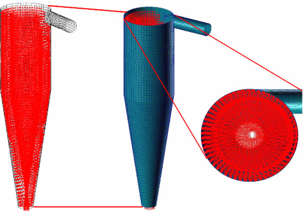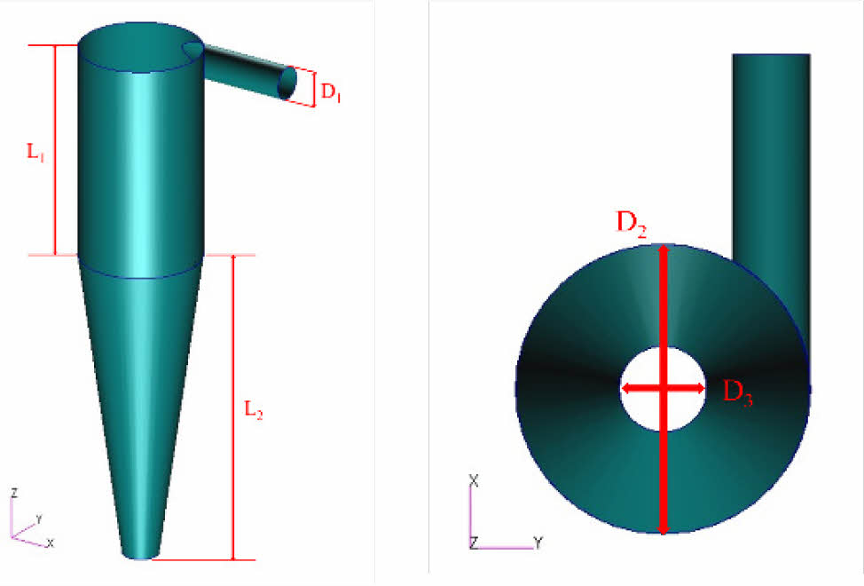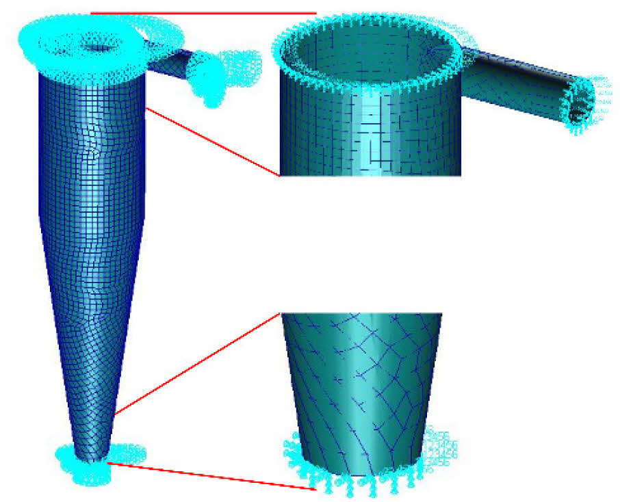 싸이클론 장치에 대해 유한요소법(finite element method)에 기반한 상용 소프트웨어인 Patran/Nastran 2018을 사용하여 구조해석을 수행하였다. Fig. 9는 주 진공 장치의 내부에 탑재된 싸이클론 장치의 형상이다. 분급기는 상단의 원통형 구조와 하단에 미세플라스틱과 분류된 모래가 유출되는 원뿔 형태의 유출부와 상부에는 수거된 입자의 유입구로 모델링하였다. 각 부품의 모델링 크기는 분급 싸이클의 길이는 각각 157.9 mm(L1), 228.14 mm(L2), 입자가 유입되는 유입구의 직경은 24 mm(D1), 분급기 상단과 하단의 유출부 직경은 각각 91 mm(D2), 27 mm(D3)이다. 구조해석 모델링은 휴대용 미세플라스틱 수거장비가 포집하는 입자 중 가장 큰 입자 크기를 고려하여 4개의 절점(node)을 가지는 절점 간 거리 5 mm의 쉘 요소(shell element)로 모델링을 수행하였다.