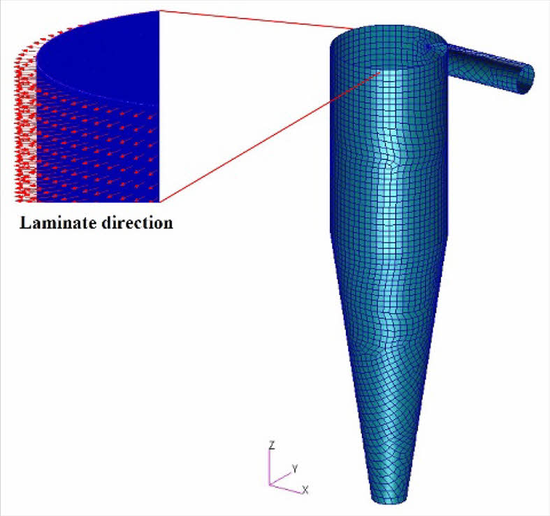 싸이클론 장치의 국부적인 파손이 있는 경우 내부 압력저하로 인한 초기 기능을 상실이 발생된다. 따라서 섬유강화복합재료를 적용하여 구조해석을 수행할 때 Tsai-Wu 파손 이론을 적용하여 파손의 발생 유무를 확인하였다. 식 (1) Tsai-Wu 파손 이론식[13]을 통해 파손 지수(f)가 1 이상인 경우 파손 발생을 의미하며 파손 발생 유무를 판단할 수 있다. Fi와 Fij는 강도 텐서이며, 적층별 파손 유무 확인을 위한 직교 이방성 복합재료의 평면응력 상태는 식 (2)~(5)으로 정의된다. Xt와 Xc는 섬유 방향의 인장강도와 압축강도, Yt와 Yc는 섬유에 대해 수직한 방향의 인장강도와 압축강도, τ12는 전단강도이다.