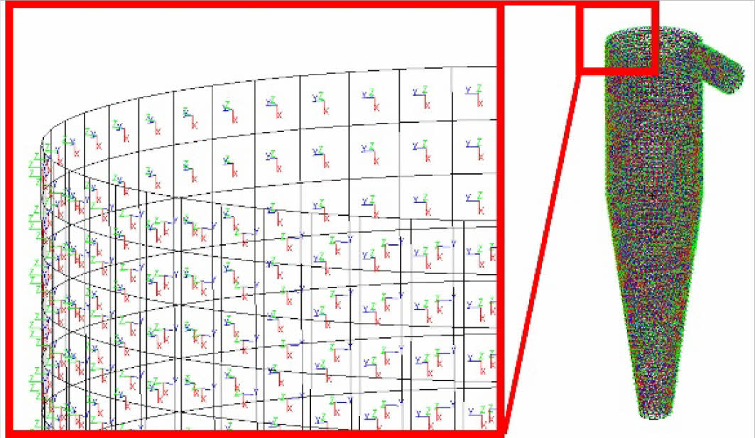 구조해석을 수행하기 위한경계조건은 Fig. 11 보이는 바와 같이 싸이클론 장치의 부품 연결부위의 절점의 6자유도를 모두 구속하였다. 하중조건의 경우 미세플라스틱 수거장비가 모래와 입자를 흡입할 때 장비 내벽에 모래 입자가 충돌하게 되므로 이를 반영하였다. 입자의 충돌 위치를 앞장에서의 전산유체해석을 통해 확인하였고, 또한 입자의 유동과 유속을 구하여 각각의 입자가 가지는 하중량을 계산하였다. 이때, 입자의 충격에 의한 하중은 동하중의 형태이므로, 이를 정하중으로 변환하는 과정을 거쳐야 한다. 입자에 의한 충격량은 운동량 보존법칙에 따라 계산하였고[14], 입자의 충격에 의해 발생될 수 있는 최대 하중을 가하기 위하여 Fig. 12과 같이 각 요소에 수직한 방향으로 하중을 적용하였다.