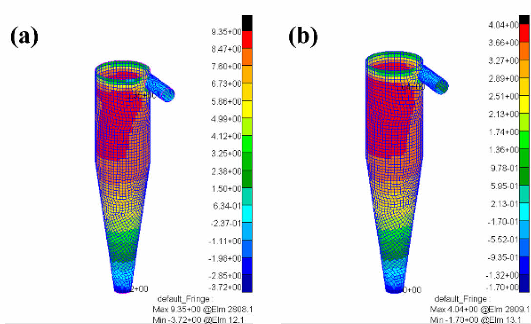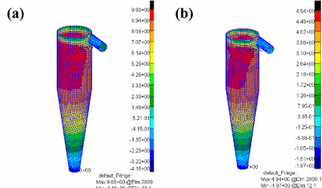 Fig. 17 Deformation result of cyclone. (a) CFRP; (b) GFRP |