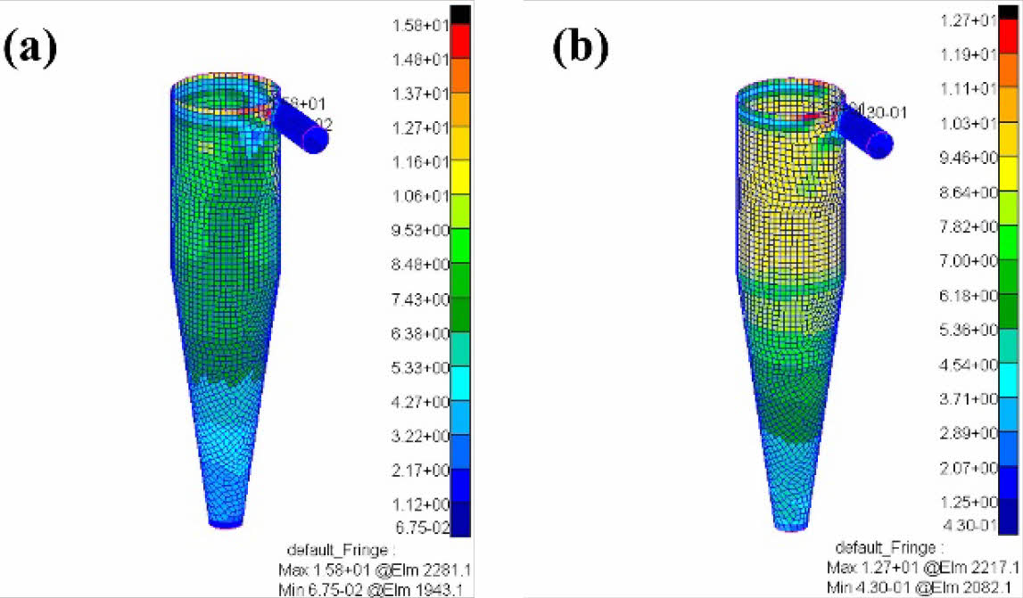 Fig. 16 Stress result of cyclone: Von-Mises. (a) ABS; (b) Aluminum |