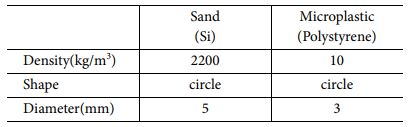 현장 조사결과로 미세플라스틱과 함께 유입되는 모래입자의 일반적인 크기는 5 mm 이하의 크기를 가짐을 확인하였다. 이에 해변가에 분포하는 모래입자의 크기 중 가장 큰 크기의 입자를 충돌입자로 가정하였다. 흡입되어 장비 내벽에 충돌하는 입자의 경우 미세플라스틱 입자보다 현저히 밀도가 높은 규소로 가정하였으며 Table 5는 입자의 정보를 나타낸다.