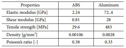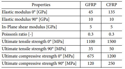 ABS와 aluminum을 적용한 해석 모델은 등방성(Isotropic)으로 적용하였다. GFRP와 CFRP를 적용한 해석 모델은 충격하중으로부터 효율적인 구조강도를 가지도록 준등방성(Quasi-isotropic)인 (±45°) 섬유방향을 포함하여, [-45°/0°/45°/90°]2S로 총 16층(Layers)으로 적층하였다[9]. 모든 적용 소재에 대하여 두께는 총 3 mm로 설계하였으며, GFRP와 CFRP의 각 층의 두께는 0.1875 mm이다. 섬유가 적층된 방향은 Fig. 10과 같이 각 요소의 수직한 방향으로 적층된다. 해석에 사용된 소재인 ABS, aluminum, GFRP 그리고 CFRP의 물성정보는 Table 3과 Table 4에 요약되어 있다[10-12].