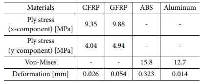 각 소재에 대한 구조해석 결과를 통한 강도 평가를 위해 각 소재에 대해 안전계수 0.7을 고려하여 비교하였다. CFRP의 경우 섬유의 길이방향에 대한 인장강도 1050 MPa, 폭방향에 대한 인장강도 35 MPa로 계산됐으며, GFRP의 경우 섬유의 길이방향에 대한 인장강도는 700 MPa, 폭방향에 대한 인장강도는 21 MPa로 계산되었다. 등방성 재료인 ABS와 aluminum에 대한 안전계수 0.7을 고려한 인장강도는 각 21 MPa과 338 MPa로 계산되었다. 전체적으로 구조해석 결과 흡입된 입자와의 충돌로 인하여 발생된 응력은 CFRP와 GFRP의 섬유길이방향과 폭방향에 대한 허용응력 그리고 ABS와 aluminum 또한 허용응력을 넘지 않아 구조적으로 안전한 것으로 나타났다. 그리고, Tsai-Wu 파손기준을 적용한 CFRP와 GFRP의 파손 유무 확인결과 발생하지 않음을 확인할 수 있었다. 또한, 각각의 적용된 소재의 구조물의 최대 변형량은 0.323 mm인 것으로 계산되어, 변형도 거의 없는 것으로 나타났다.