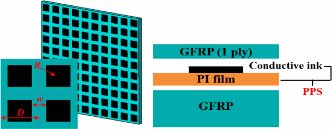 Fig. 5는 설계된 주기패턴 레이더 흡수 구조의 제작 과정을 보여주고 있다. PPS는 패턴이 가공되어 있는 얇은 금속 시트인 메탈마스크와 Bar-coater 장비를 이용하여 제작하였다. PPS 제작에는 75 μm 두께의 PI 필름과 Loctite 社의 M 2012RS 전도성 잉크를 사용하였다.