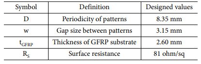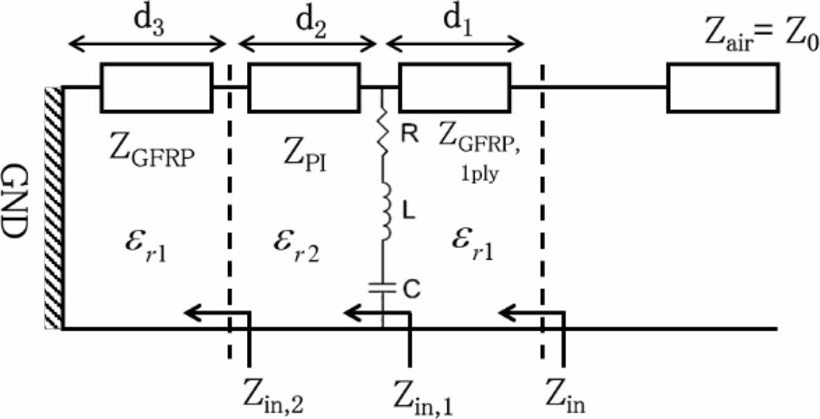 Conductive ink로 제작된 주기패턴의 임피던스인 ZPattern는 식 (2)와 같이 나타낼 수 있으며 입력 임피던스 Zin은 식 (3)-(6)을 통해 계산할 수 있다. 여기서 εr1, εr2는 GFRP와 PI film의 복소유전율, d는 각 층의 두께를 의미한다.