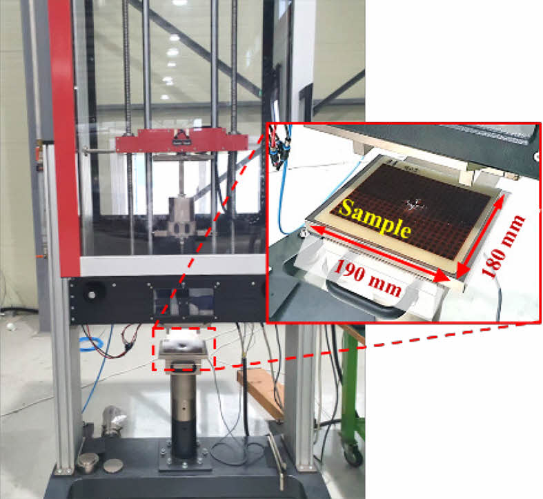 다양한 형태의 손상이 발생한 주기패턴 레이더 흡수 구조의 충격 후 전자기파 흡수 성능을 평가하기 위해 저속충격시험을 수행하였다. 저속충격시험은 경남테크노파크 항공우주센터에서 보유하고 있는 자유낙하시험기(HIT600F, Zwick Roell)를 활용하였으며, 저속충격시험의 셋업은 Fig. 6에 나타내었다. 자유낙하시험은 장비 상단부의 가이드를 따라 충격체가 자유낙하하여 구조에 충격에너지를 가한다. 자유낙하시험은 시편에 가하고자 하는 충격 에너지를 낙하 높이 또는 충격체의 중량을 변경하여 결정할 수 있으나, 본 연구에서는 충격체의 중량은 고정하고 낙하높이를 조절하는 방식을 채택하였다.