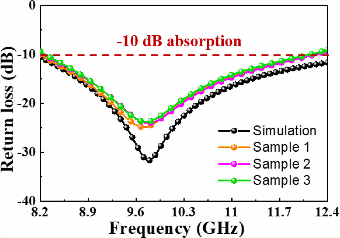 손상이 발생한 주기패턴 레이더 흡수 구조의 성능평가를 위한 기준지표를 획득하기 위해 손상이 발생하지 않은 온전한 구조의 전자기파 흡수 성능을 먼저 확인하였다. Fig. 8은 시뮬레이션 및 실제 측정을 통해 획득한 반사손실을 나타낸다. 총 3개 샘플의 측정을 수행한 결과 모두 유사한 전자기파 흡수 성능을 보였다. 측정에 사용된 3개의 레이더 흡수 구조 샘플은 8.28-12.13 GHz 주파수 대역에서 -10 dB 이상의 반사손실을 보였으며, 9.7 GHz 부근에서 반사손실의 Peak를 나타냈다. 시뮬레이션 결과와 측정결과를 비교했을 때 반사손실의 경향은 유사하게 나타났으나 전자기파를 90% 이상 흡수하는 주파수 대역 및 공진 주파수가 소폭 감소하였다. 이는 레이더 흡수 구조의 설계로 획득한 두께와 실제 제작된 구조의 두께의 차이와 각 패턴에서의 면저항이 정확히 일치하지 않음에 의해 발생한 오차로 판단된다. 오차 요인은 설계 과정에서 고려되지 않기 때문에 일정 수준의 오차를 갖게 된 것으로 보인다. 시뮬레이션 결과와 측정결과가 정확히 일치하지는 않지만 그 경향은 유사하였고, 목표로 하는 X-band 대역에서의 흡수 성능은 우수하였다. 또한 본 연구에서는 레이더 흡수 구조의 성능 저하를 평가하는 것이 주요 목표이기 때문에 발생한 오차를 용인하고 계속해서 연구를 진행하였다.